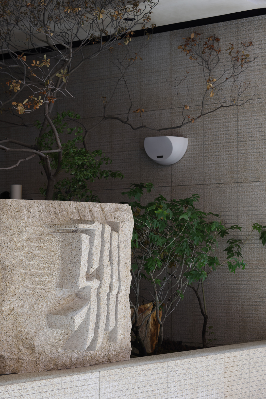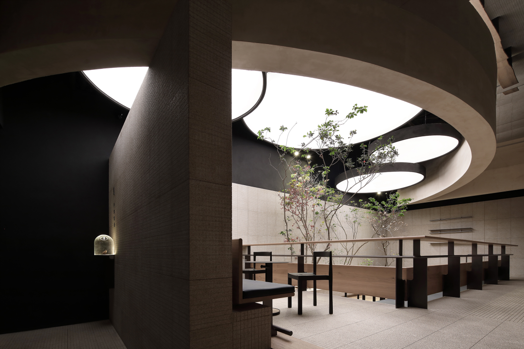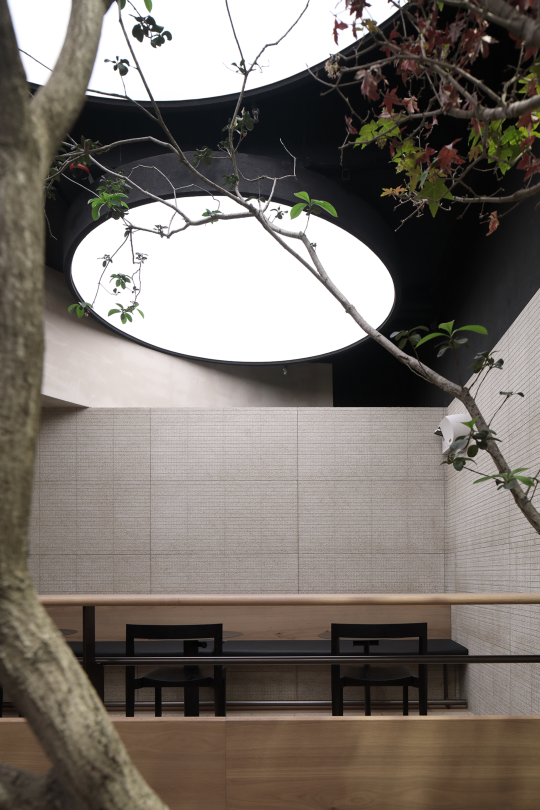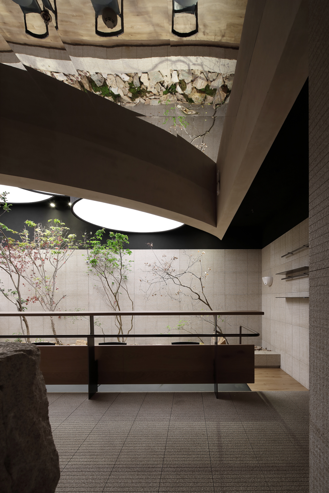 绿植摒弃端庄方正的盆景,移植整株树木,仿效自然生长在山间的翠色,天然之姿的点缀,让石质空间有了灵动的生命力。