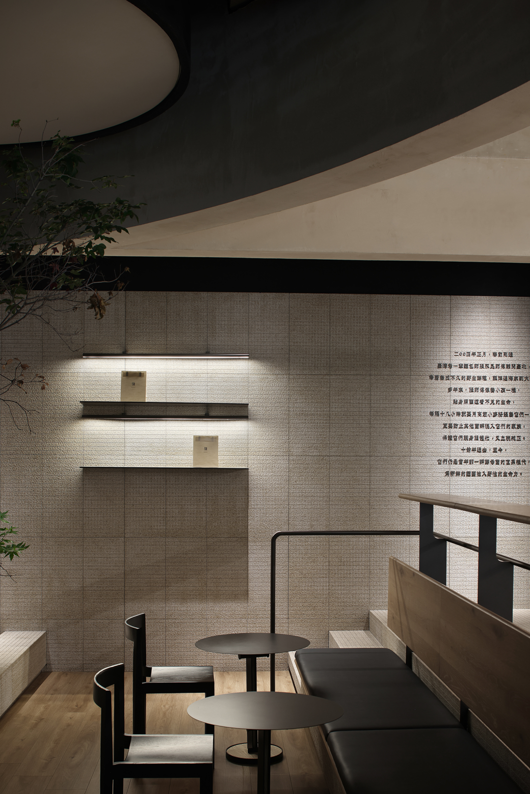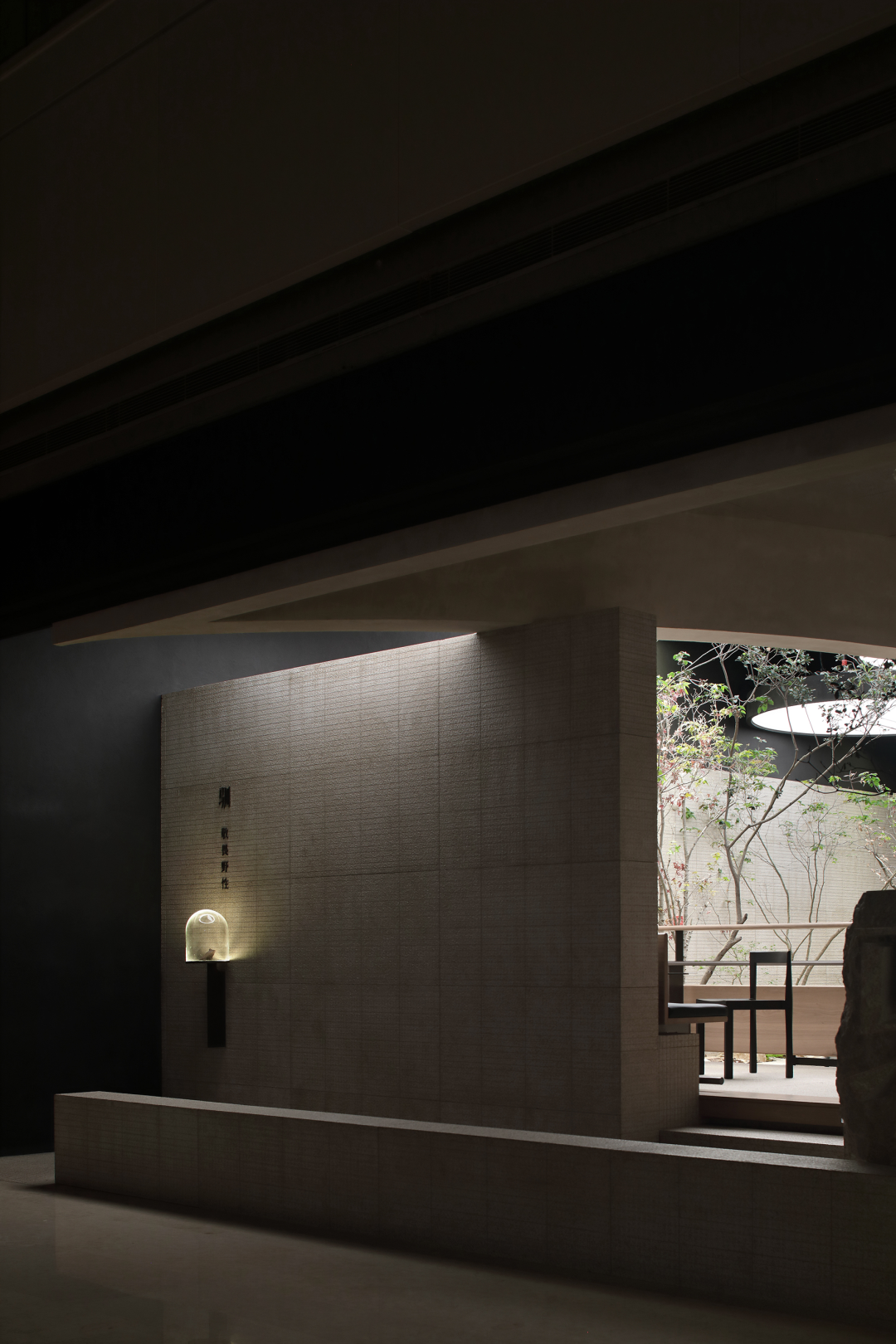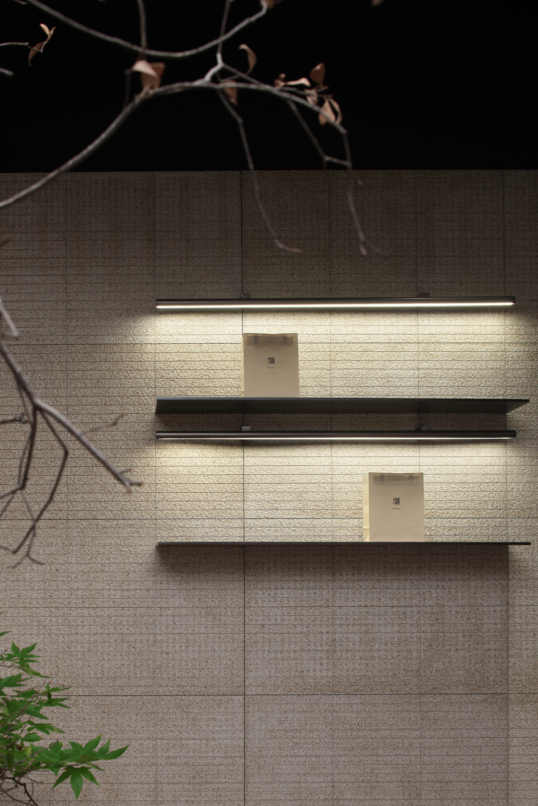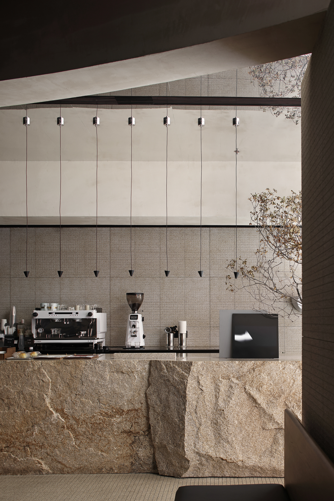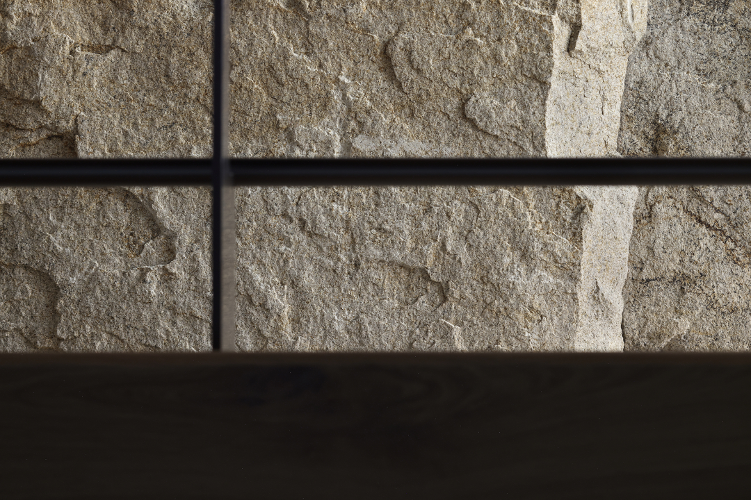 设计师运用天然石料,打造了空间的整体氛围:将切割和掏空的石材加工成细长的条状,铺贴在墙面和地面上,使墙与地相互交织,仿佛山岩肌理延伸至整个空间。在光影的交错中,仿佛置身于山野大地,感受到沉稳与宁静。