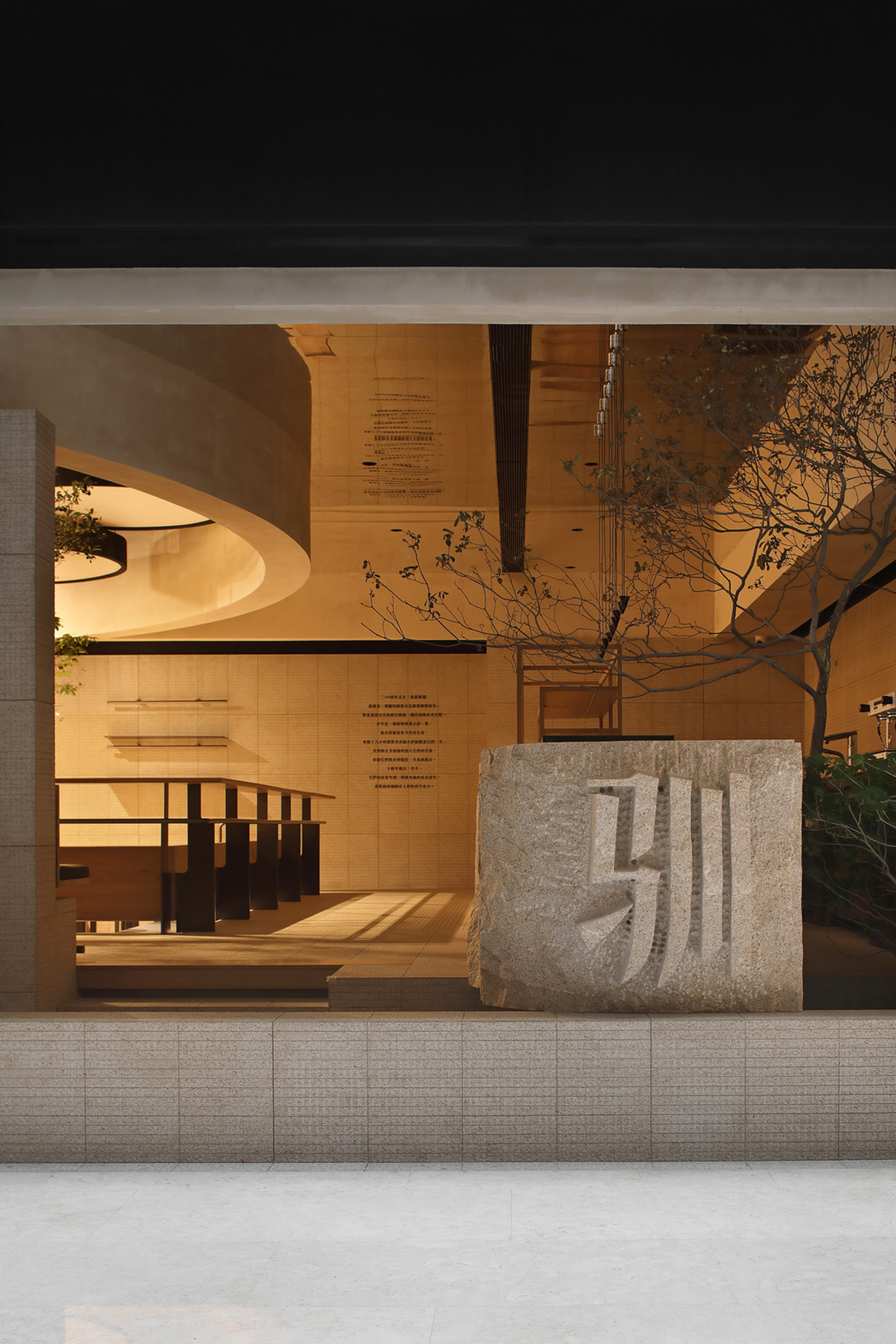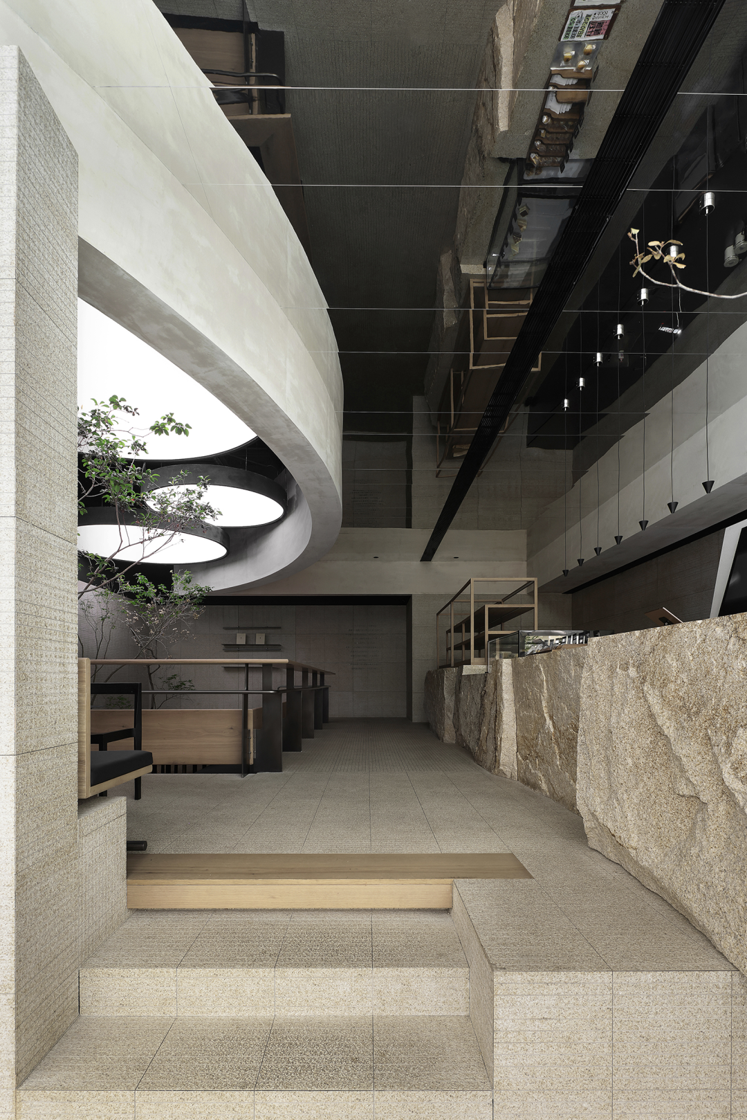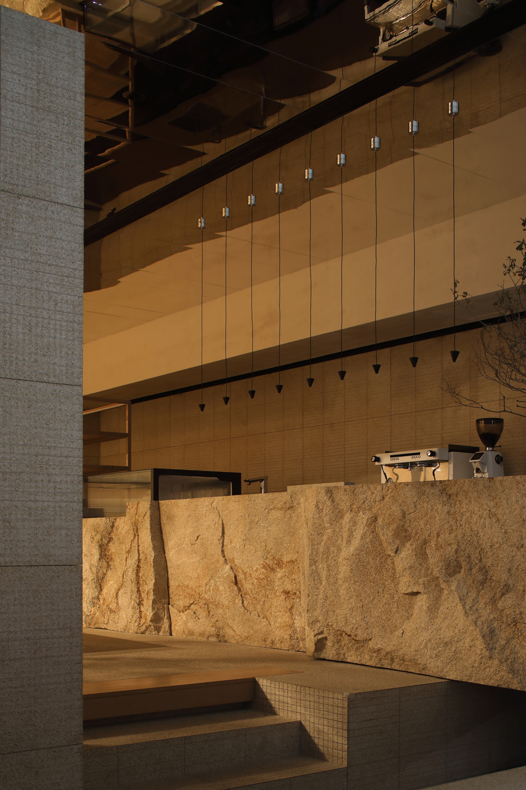 一块原石,变化万千。荒石粗旷,空间却不失温润和谐,石料选用暖色黄锈石,烘焙特有的温度感流淌于场域间。