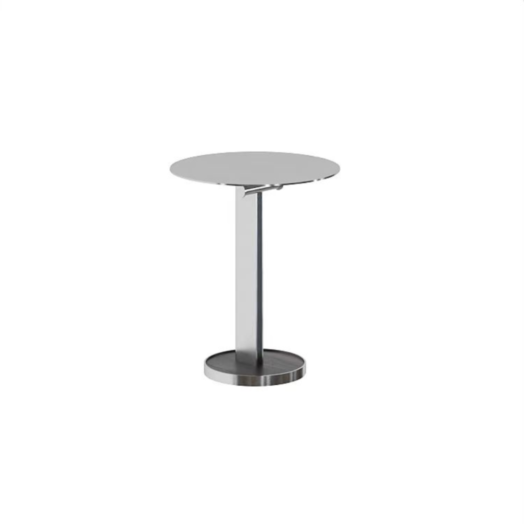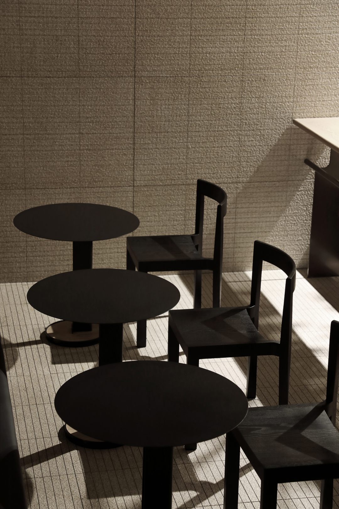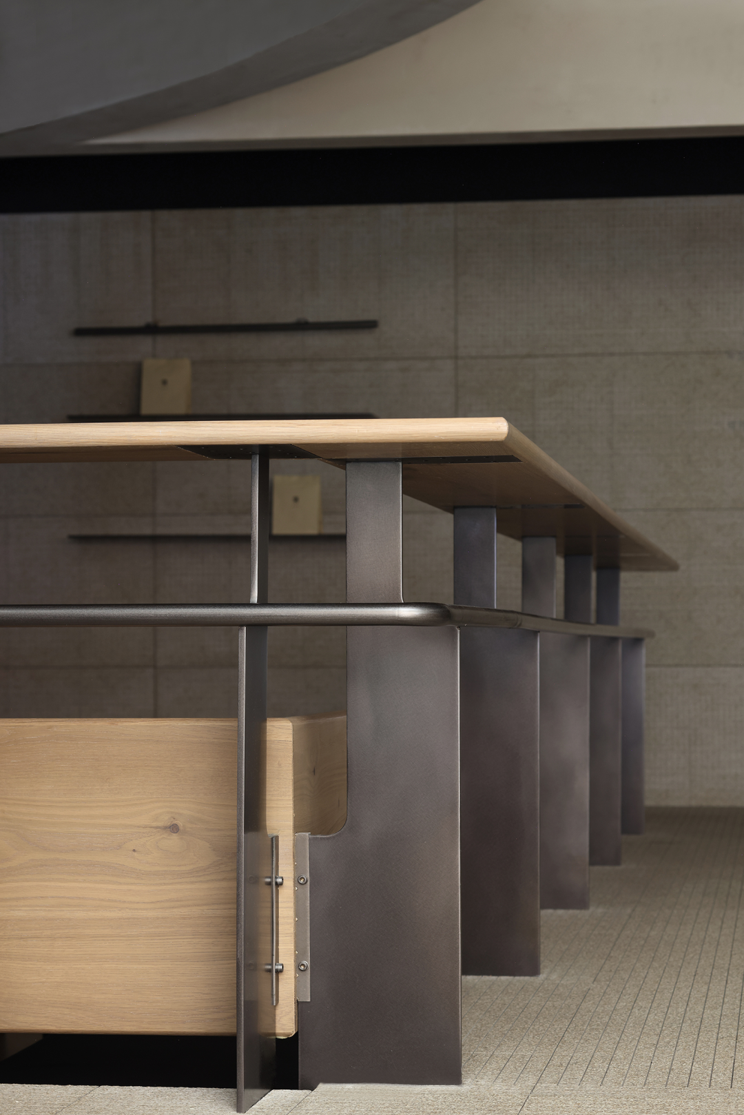 配搭的家具,一体成型的卡座是由磨砂金属加橡木扶手栏杆定制,为空间专门定制的圆形餐桌,外观利落,桌面下可挂包钩,适合中小型场所。