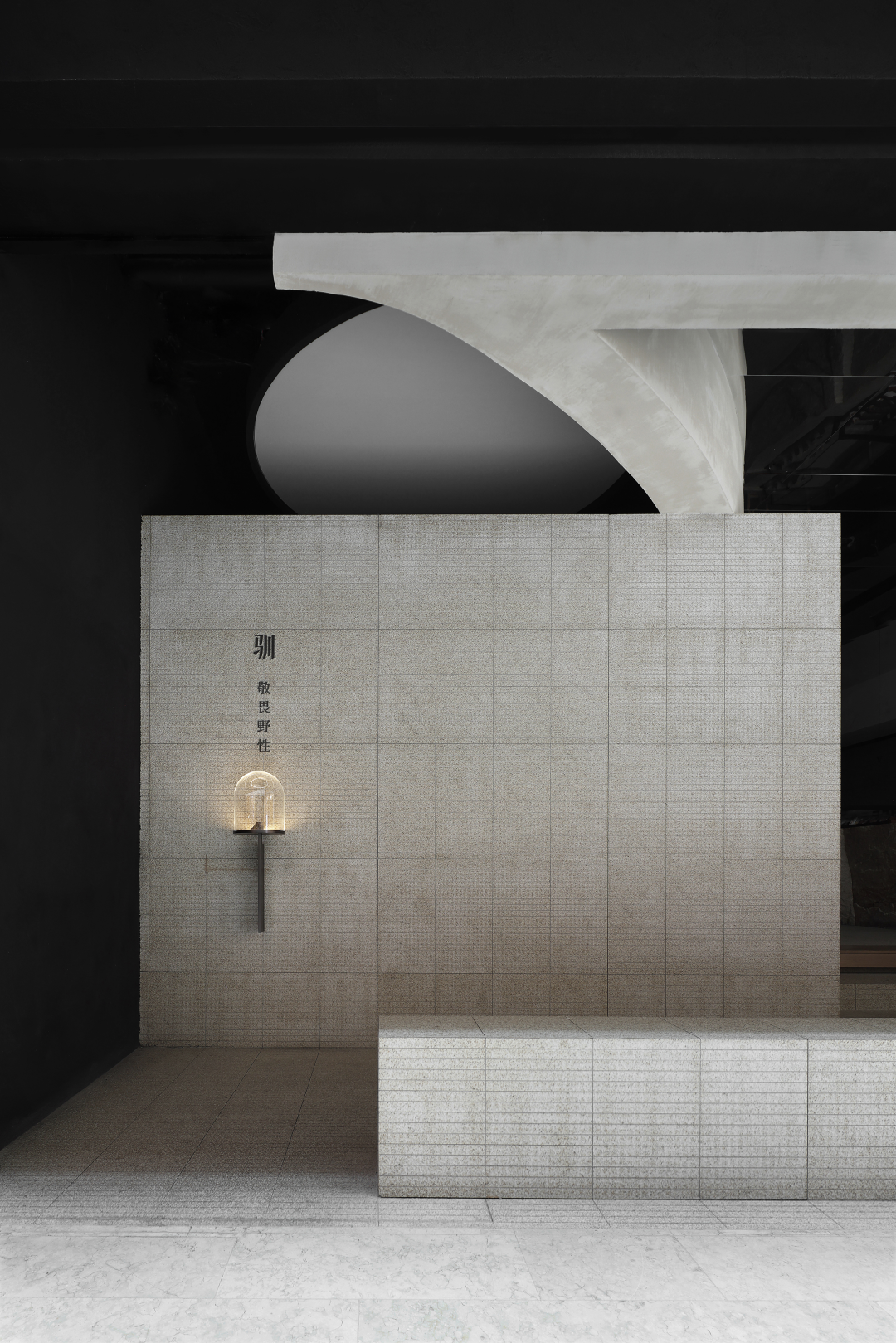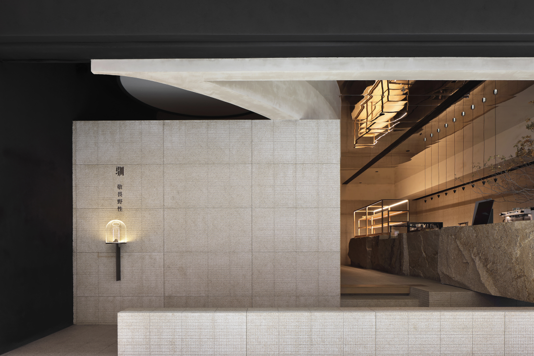 仿若山岩浑然天成,门头设计跳脱传统,以立体雕刻的方式呈现品牌LOGO“驯“。“驯“于吧台山石中延伸而出,如随风而生,被自然琢刻,在粗旷山石上别具力量感。