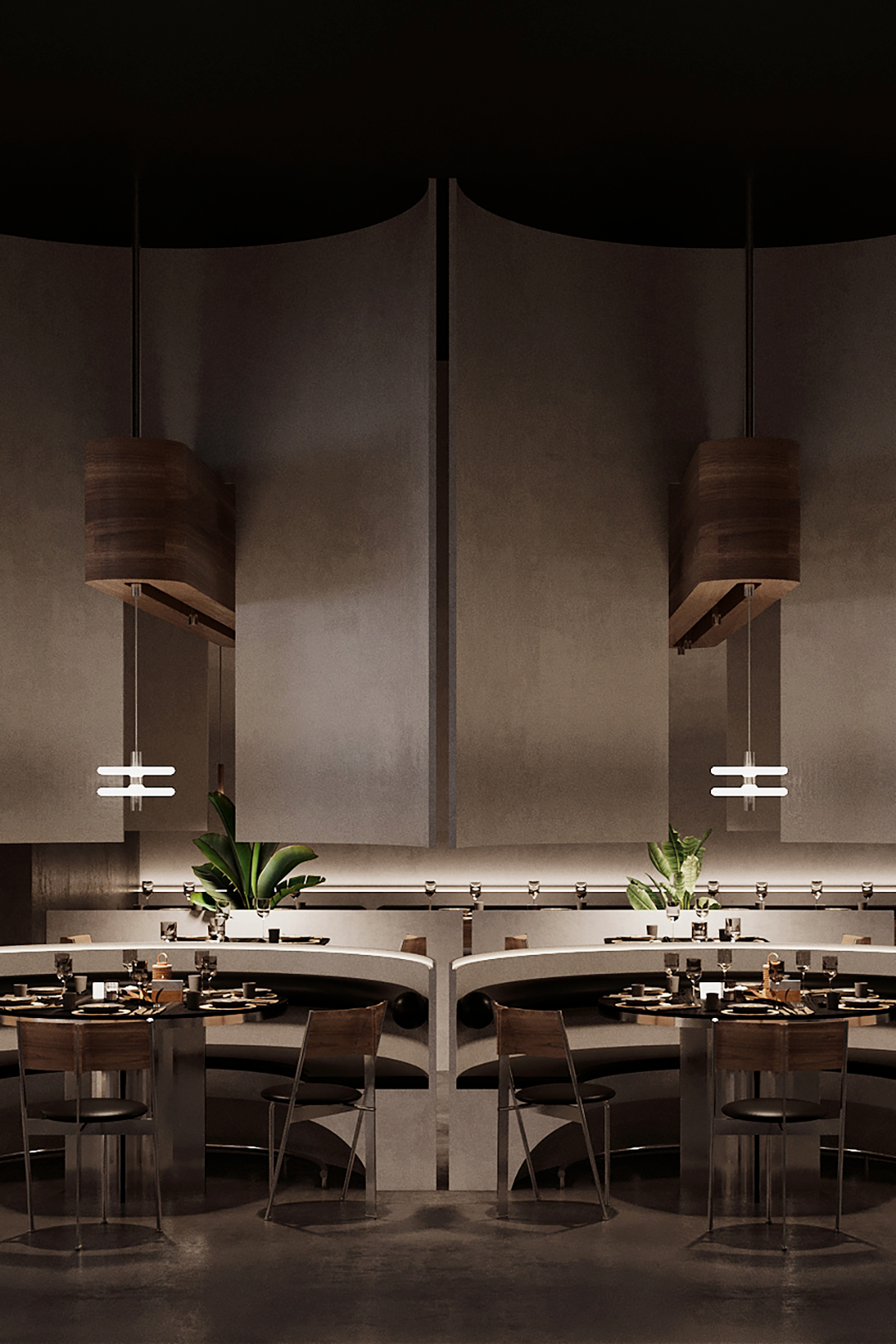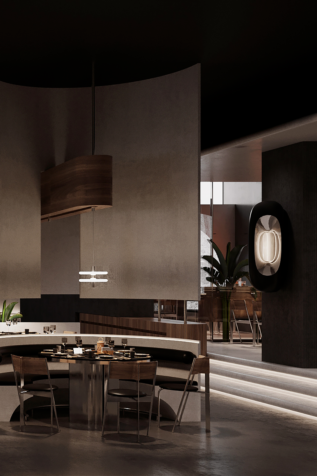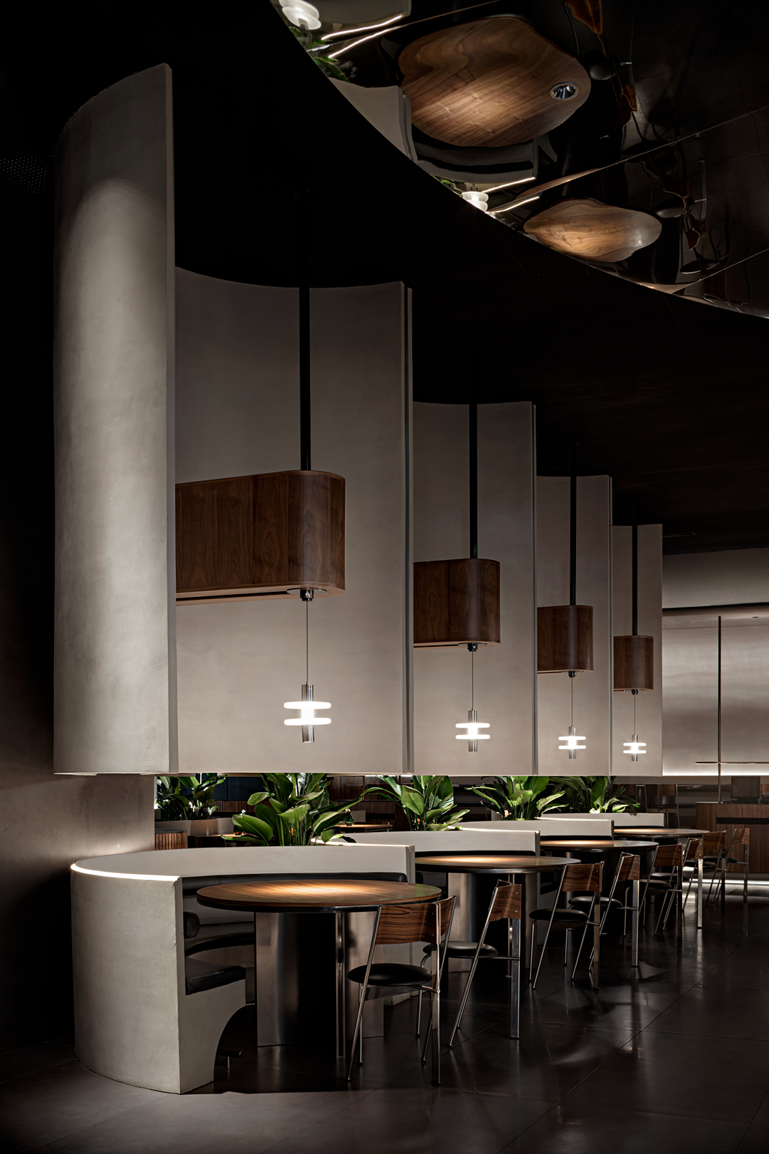 下沉区域吊顶以圆弧造景,三个大小不一的圆形做为顶灯,保证主用餐区域的照明同时,不打破空间中的自然氛围,也使线条鲜明的场域有了柔和的视觉触感。