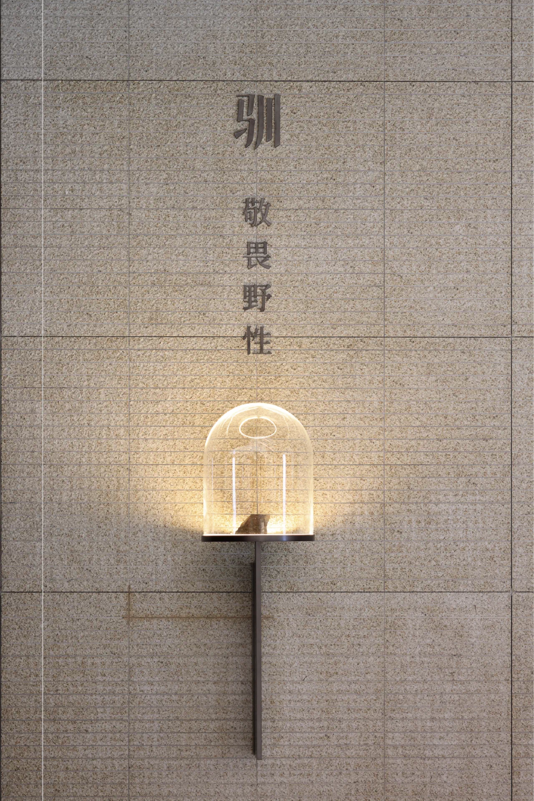 隔断以质璞山岩铺装,没有多余的灯光,隐在暗处,唯有玻璃灯罩中暖灯亮起,仿佛岩洞里一盏烛火莹莹,映照着〝驯敬畏野性”数字。于细节中点亮品牌,亦点出空间的设计主题。