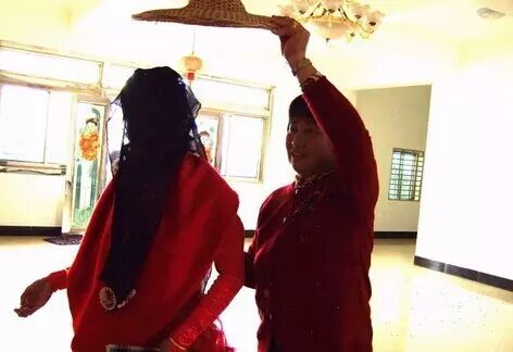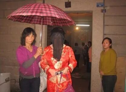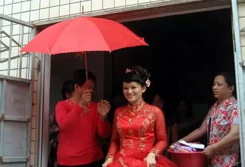 新娘子出门前还要在被窝里“犹抱琵琶半遮面” ,直到“千呼万唤始出来”之时还必须哭着向父母辞行。即使你是满心欢喜也要硬挤出几滴眼泪——以示对父母的不舍和对父母养育之恩的感激 , 否则会被别人笑话的。新娘的母亲及嫂婶也需哭着为其送行 , 俗称: “哭缘” ,出门之前新娘的兄弟要帮新娘打开红伞(用红伞取代红盖头),新娘要出门时需撑着红伞从一个上面放着燃香火炉的米筛上跨过,据说是可以辟邪。新娘的叔伯还要帮其“挑花担” 。新郎则要前来将新娘接到轿车中,到了新郎家中,两个新人也同样要跨过相同的米筛火炉以去邪,到新郎家时新娘也需撑红伞直至“进房” 。新郎新娘“进房”的时间也是有讲究的, “进房”时新郎的家属需回避(不能看)。然后新婚夫妇仪式就完成了,之后喜宴正式开始。