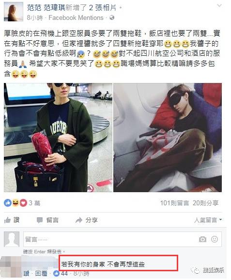 今年一月初,范玮琪在脸书上分享她精打细算的一面,指其在飞机上跟空服人员多要了两双拖鞋,且在饭店里也要了两双,这样家里就可以有四双了。文中她也有自嘲说这样做会不会很低级,希望大家不要见笑~还说职场妈妈比较精嘛~