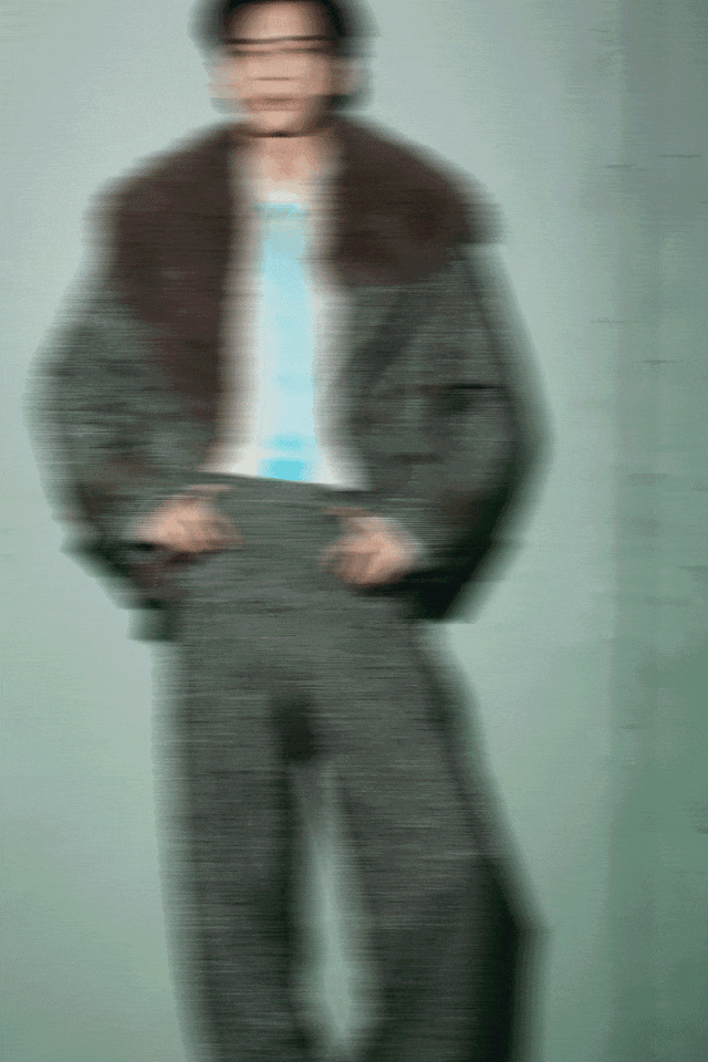 人字纹环保皮草拼接夹克、人字纹褶裥西裤 均为XU ZHI