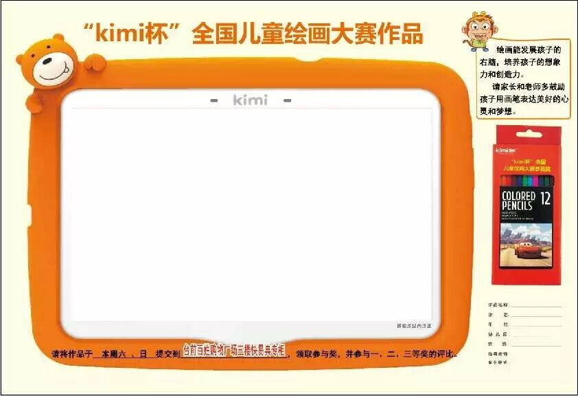 小朋友使用“kimi杯”绘画大赛专用画纸绘画一幅,主题“ 我爱我家”,画好后将画作提交到以下指定地点方可参赛。画纸即日起至5月30日之前到交画地点领取。