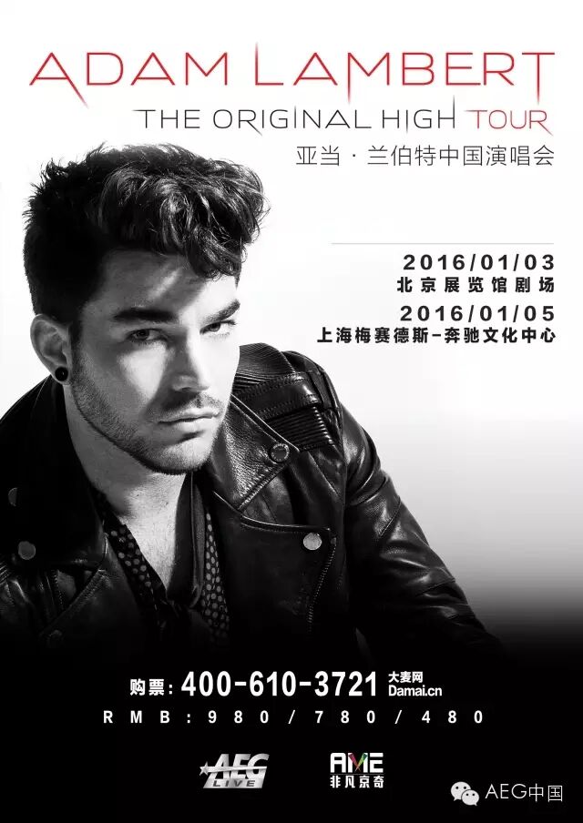 当爷Adam Lambert 2016年世界巡演 The Original High 现已公布,将于2016年1月3日强势登陆北京展览馆剧场,并于2016年1月5日转战上海梅赛德斯-奔驰文化中心震撼开唱。总共两站。