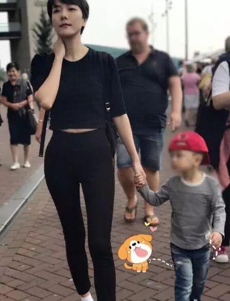 穿黑色短上衣搭配一条黑色紧身裤,完全就是少女的模样啊,哪里看的出来是孩子的妈妈啊!