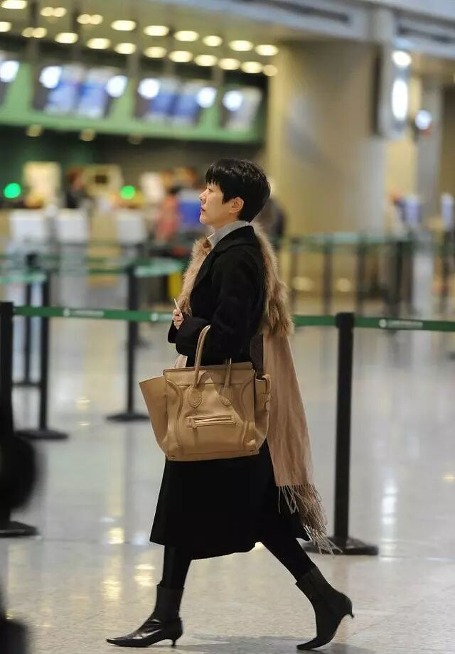 机场里的杨乐乐,一身黑色大衣,让自己美出新高度,脚上搭配一双尖头黑色短皮靴,很有女王的气场呢!特别是她的围巾,搭配的很有特色,很吸睛!