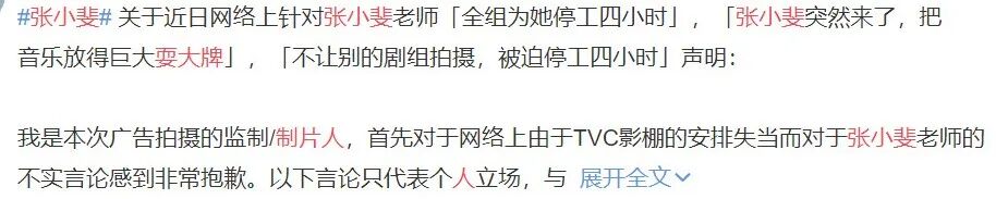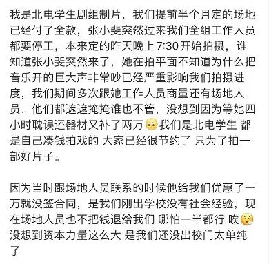 去年6月一网友自称是北电的学生,爆料张小斐突然来拍摄平面广告,音乐声开得很大,严重影响了他们工作,沟通无果后他们只好妥协,最后导致浪费4个小时,损失了2万块。