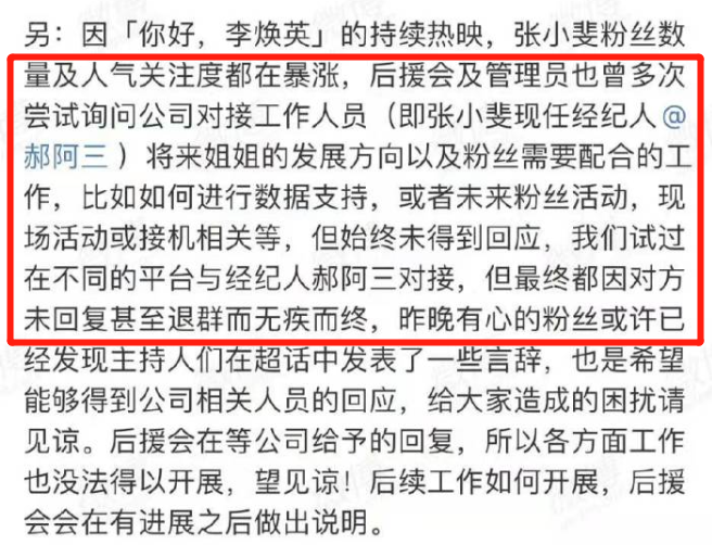 但张小斐后援会成立后,管理员主动多次找到张小斐公司的工作人员,均被无视,最后以解散告终。