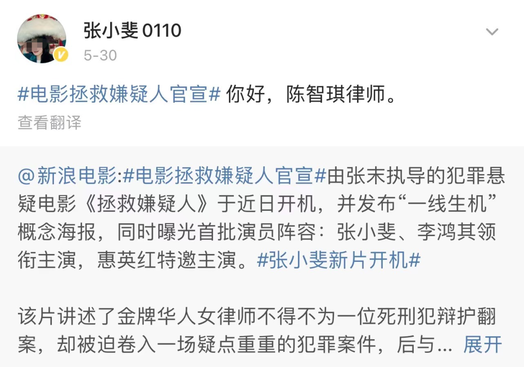 同月30号,宣布由张末执导的犯罪悬疑电影《拯救嫌疑人》开机,斐妈又是主演;
