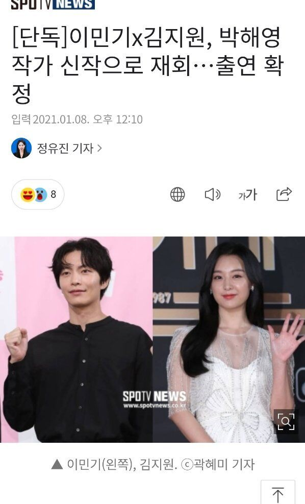 8日,据相关人士表示,李民基和金智媛近日确定出演朴海英作家的新作。该剧将通过JTBC播出,预计于今年中旬开始拍摄。通过《Old Miss Diary》、《住在清潭洞》、《又吴海英》、《我的大叔》等作品进入人气作家行列的朴海英作家有望再次通过新剧与观众见面。。李民基和金智媛2018年曾通过《朝鲜名侦探:吸血怪魔的秘密》合作,期待此次再次合作的两位演员展现更好的面貌。