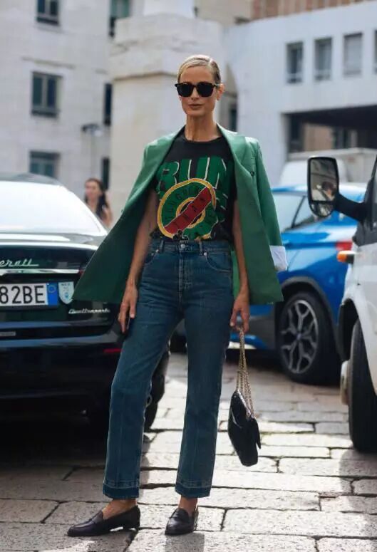 黑色T恤+牛仔裤彰显出街头潮酷范,外搭绿色垫肩西装外套增添整体的气场,而绿色西服外套又跟T恤的字母颜色相呼应,相得益彰!