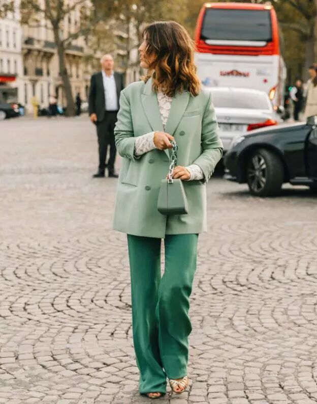 绿色也有分很多种,像这种薄荷绿看起来就充满了复古的气息,搭配同色系不同深度的绿色西装长裤,既随意大方又不失格调!