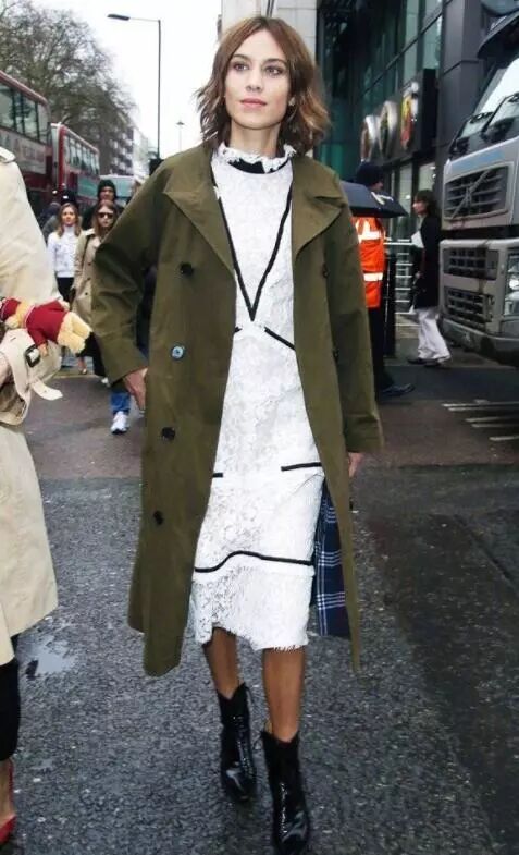 钟小姐用甜美清新的白色连衣裙搭配率性的军绿色风衣看起来既帅气又甜美!混搭得非常绝妙,再蹬一双黑色靴子就很有时髦范了!