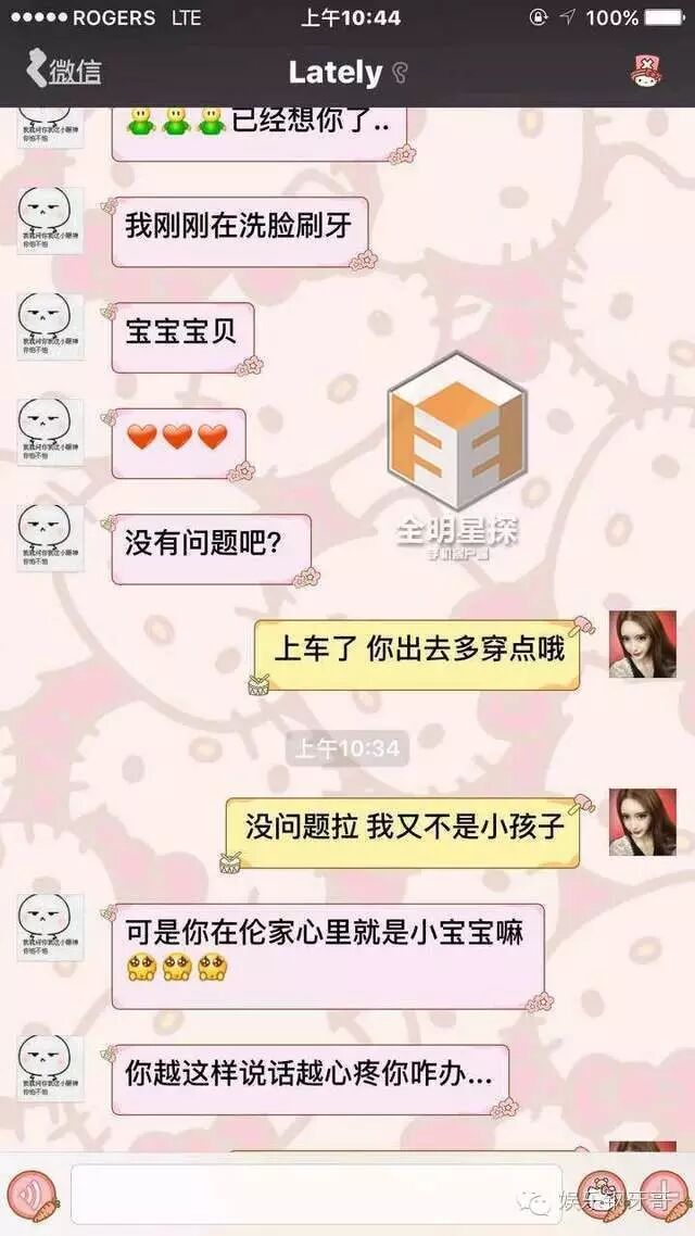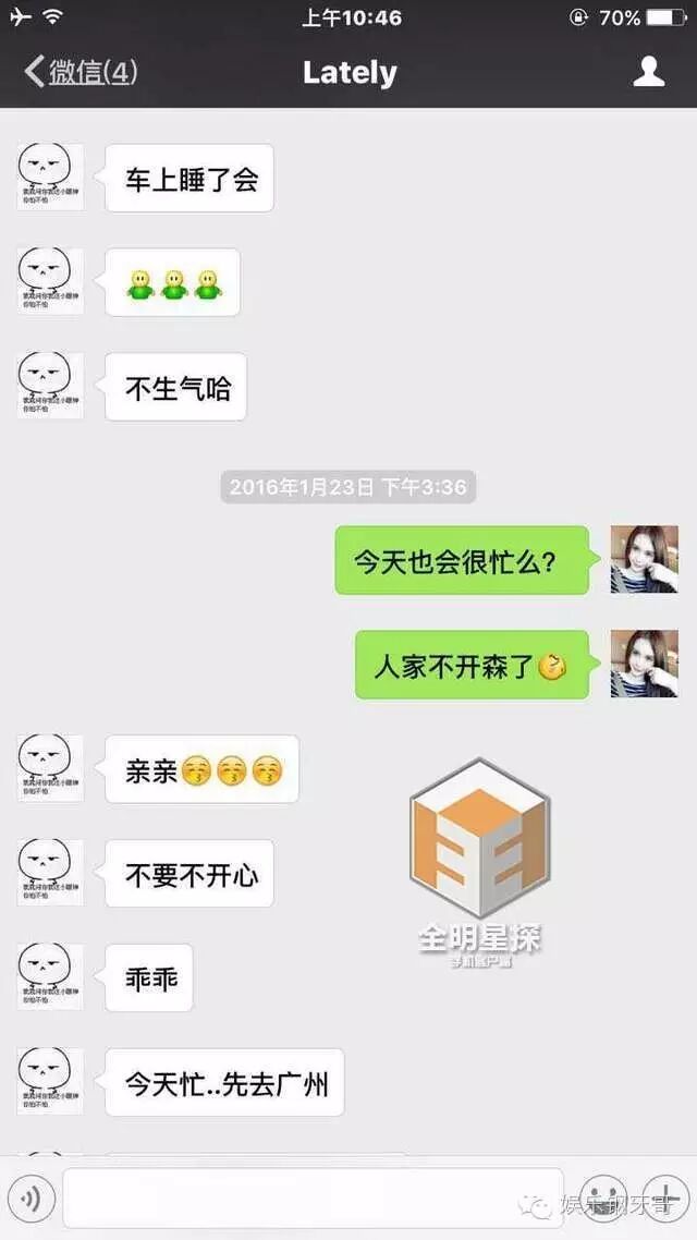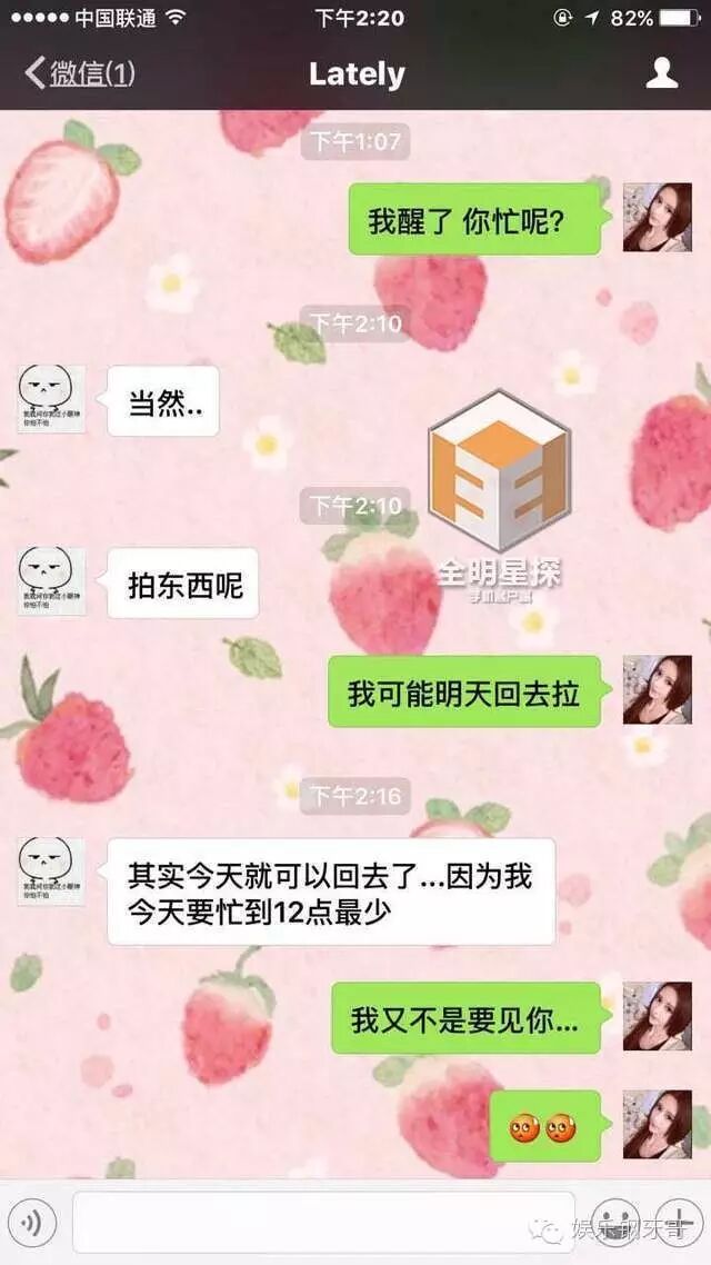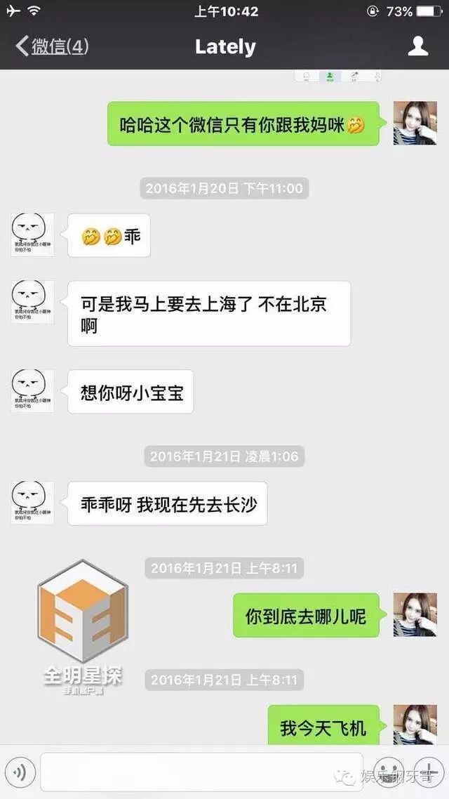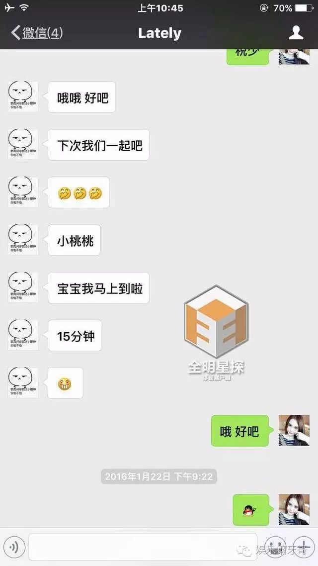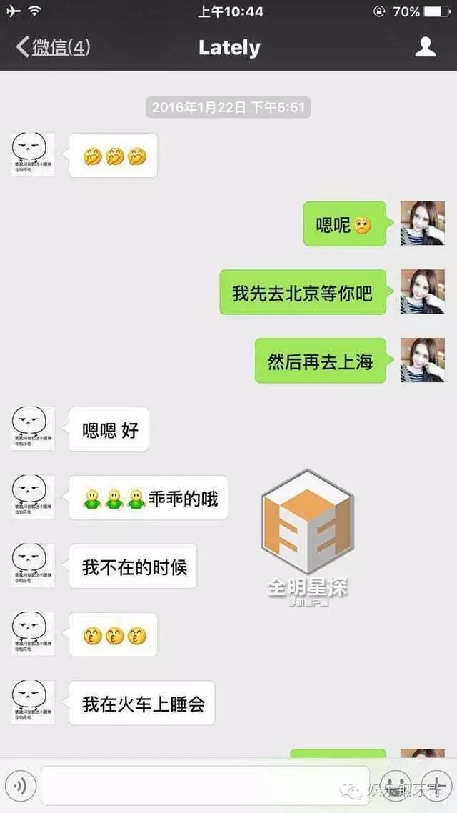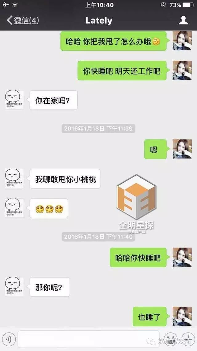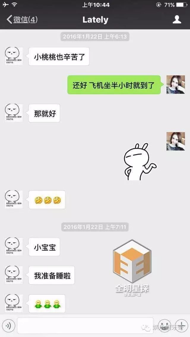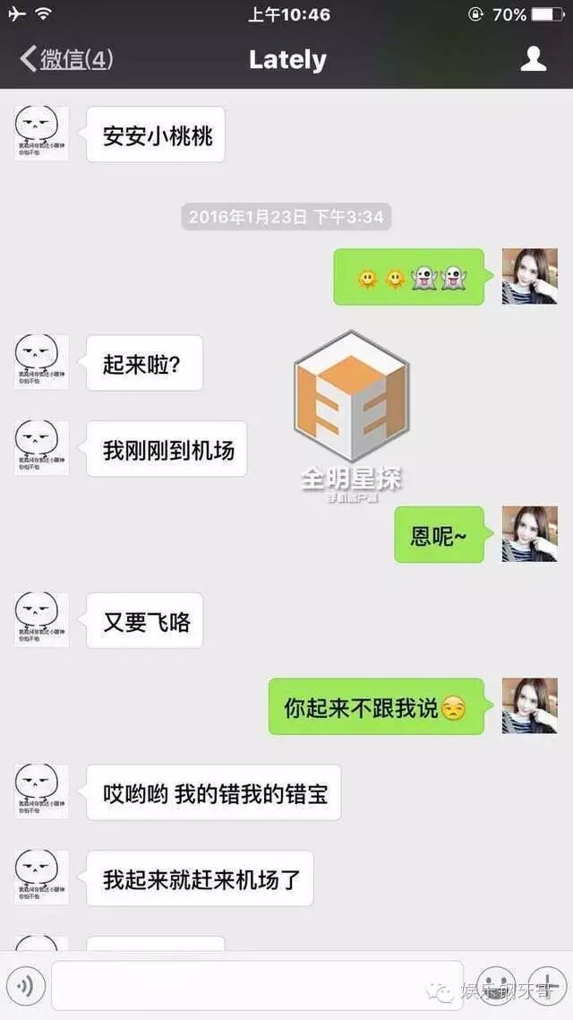经过短暂的甜蜜后,吴亦凡回到中国工作,从长沙飞到安徽,再从台北飞到上海,一路奔波,而小G娜则一直留在温哥华,但距离阻挡不了两人之间谈情说爱,期间小G娜和吴亦凡一直微信联络。从小G娜提供的她与吴亦凡之间的微信聊天内容可以看出,在1月中下旬期间两人似乎正处在甜蜜期。吴亦凡管小G娜叫“小桃桃”,并称:“我最爱你的素颜,快被你迷死了!”吴亦凡在微信中还曾让小G娜来多伦多陪自己。钢牙哥看到这这聊天记录后,真心觉得甜到齁~原来你是这样的吴亦凡?