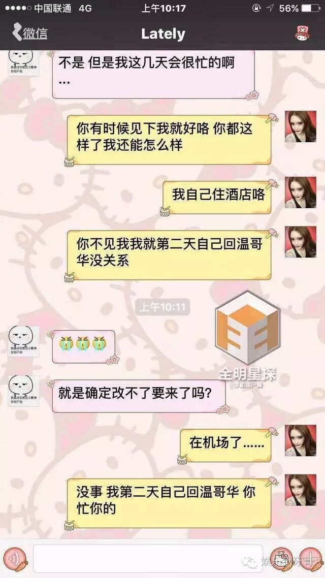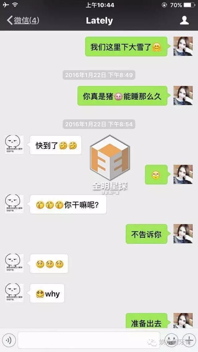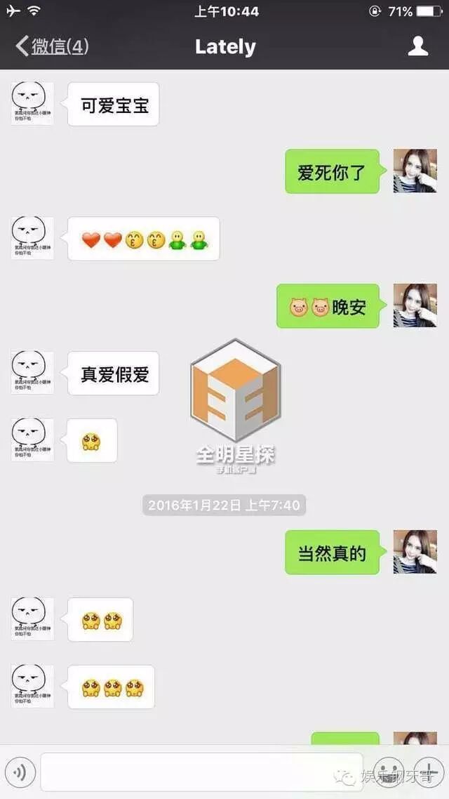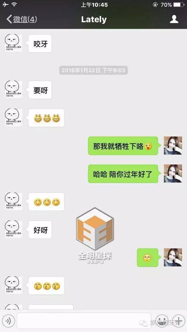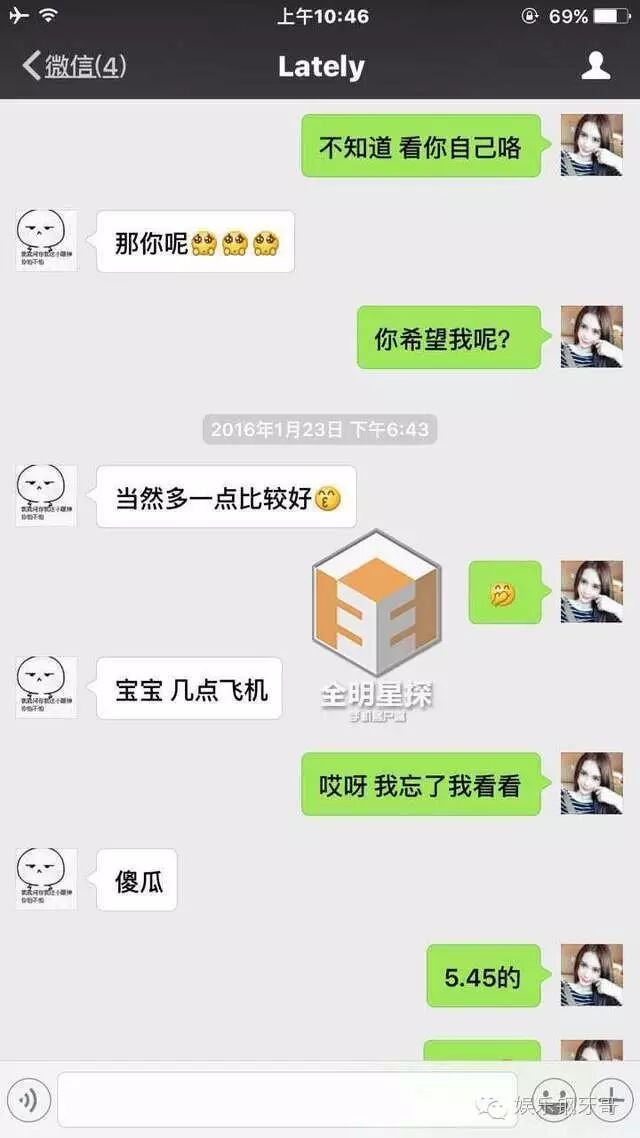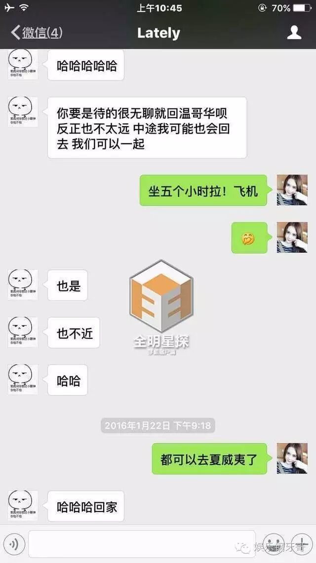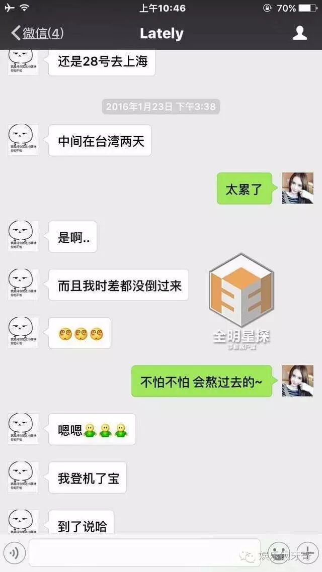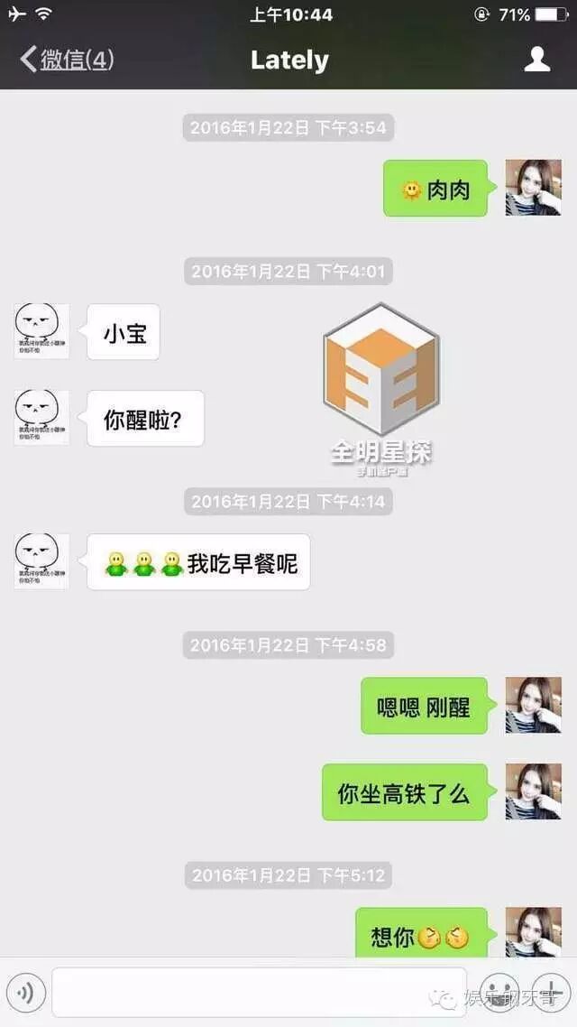 经过短暂的甜蜜后,吴亦凡回到中国工作,从长沙飞到安徽,再从台北飞到上海,一路奔波,而小G娜则一直留在温哥华,但距离阻挡不了两人之间谈情说爱,期间小G娜和吴亦凡一直微信联络。从小G娜提供的她与吴亦凡之间的微信聊天内容可以看出,在1月中下旬期间两人似乎正处在甜蜜期。吴亦凡管小G娜叫“小桃桃”,并称:“我最爱你的素颜,快被你迷死了!”吴亦凡在微信中还曾让小G娜来多伦多陪自己。钢牙哥看到这这聊天记录后,真心觉得甜到齁~原来你是这样的吴亦凡?