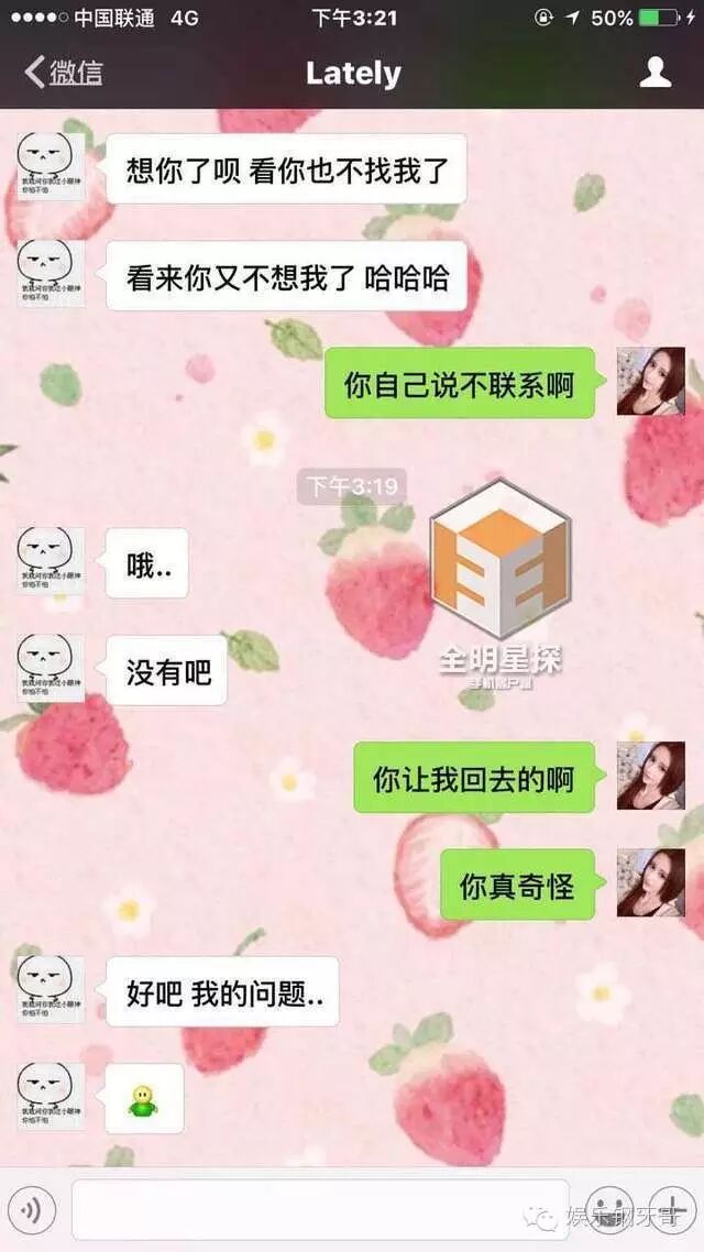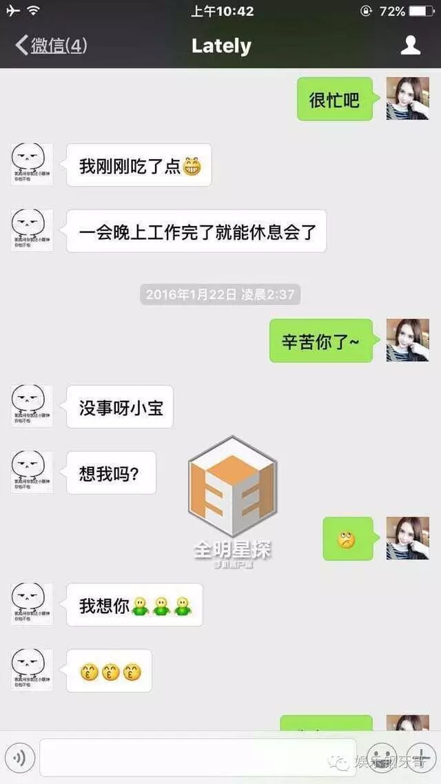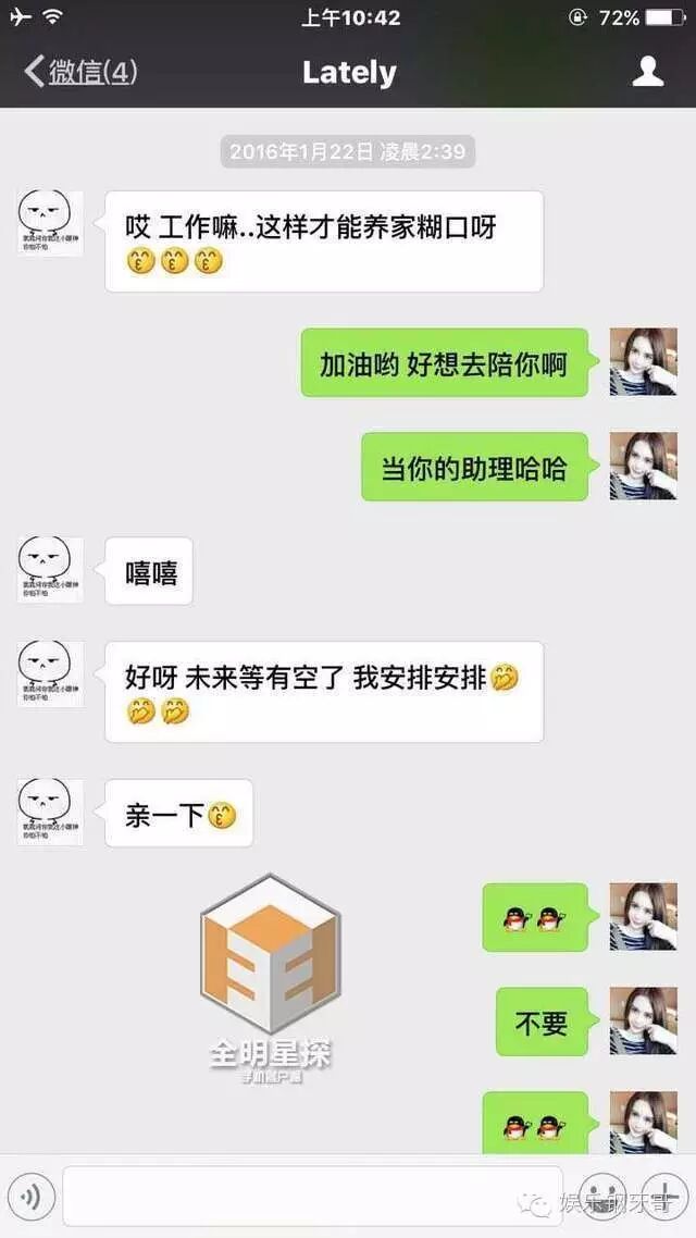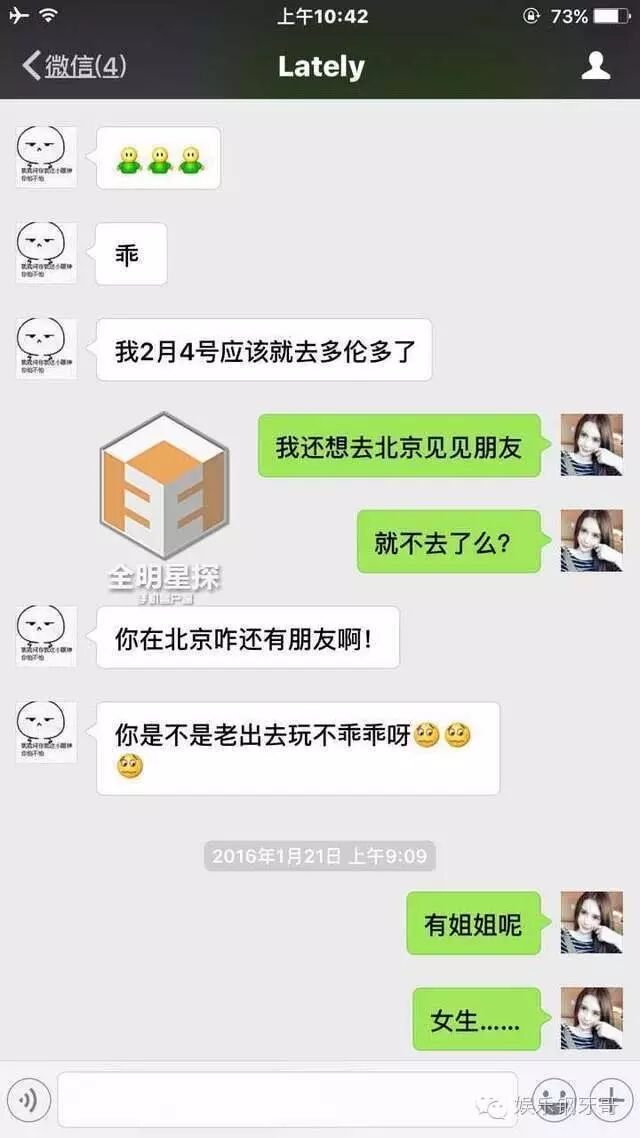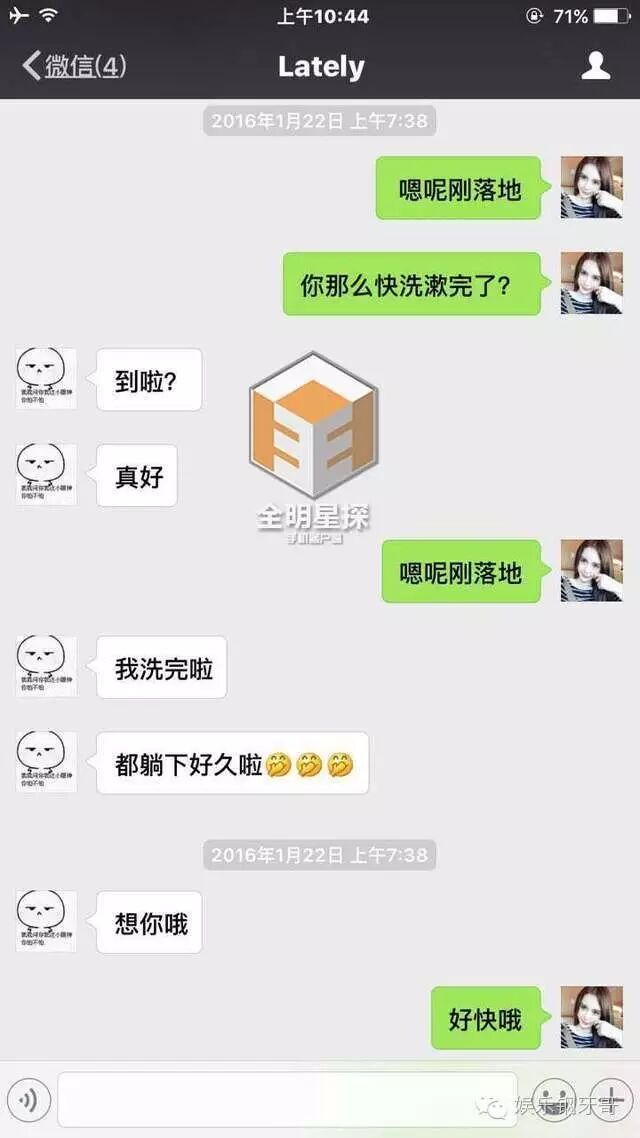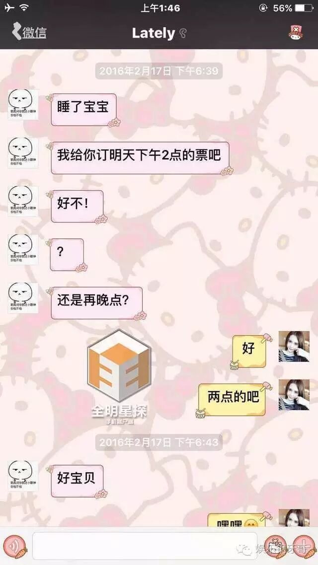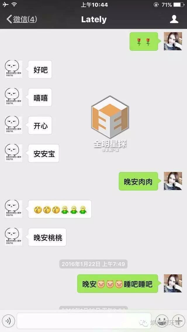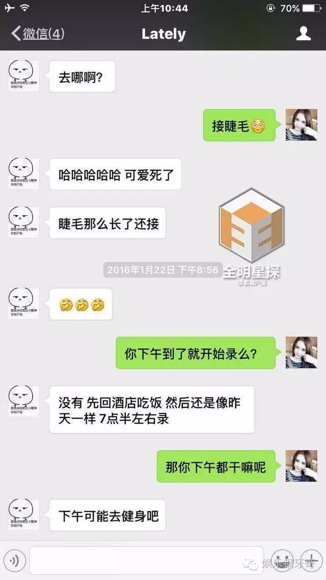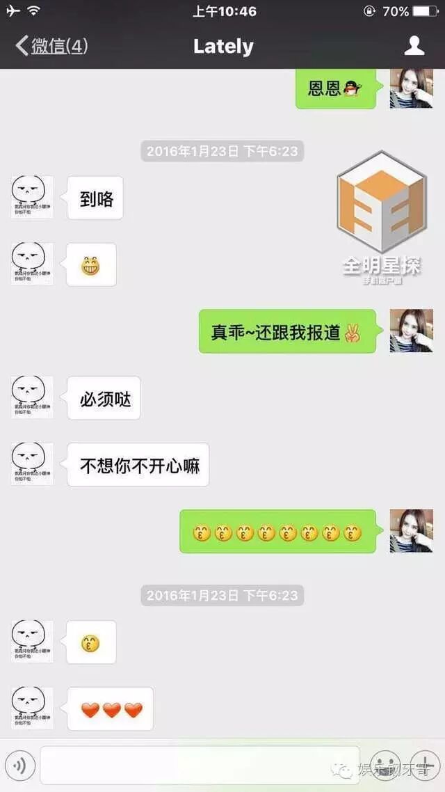 经过短暂的甜蜜后,吴亦凡回到中国工作,从长沙飞到安徽,再从台北飞到上海,一路奔波,而小G娜则一直留在温哥华,但距离阻挡不了两人之间谈情说爱,期间小G娜和吴亦凡一直微信联络。从小G娜提供的她与吴亦凡之间的微信聊天内容可以看出,在1月中下旬期间两人似乎正处在甜蜜期。吴亦凡管小G娜叫“小桃桃”,并称:“我最爱你的素颜,快被你迷死了!”吴亦凡在微信中还曾让小G娜来多伦多陪自己。钢牙哥看到这这聊天记录后,真心觉得甜到齁~原来你是这样的吴亦凡?