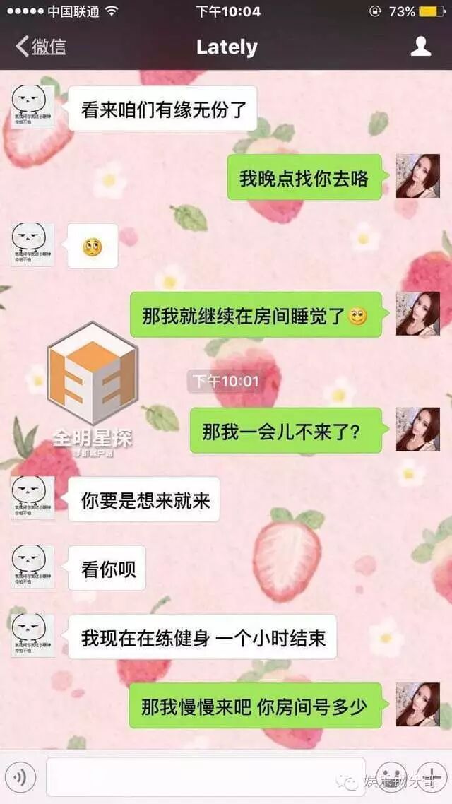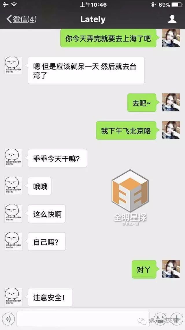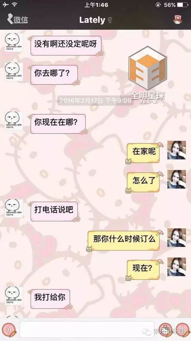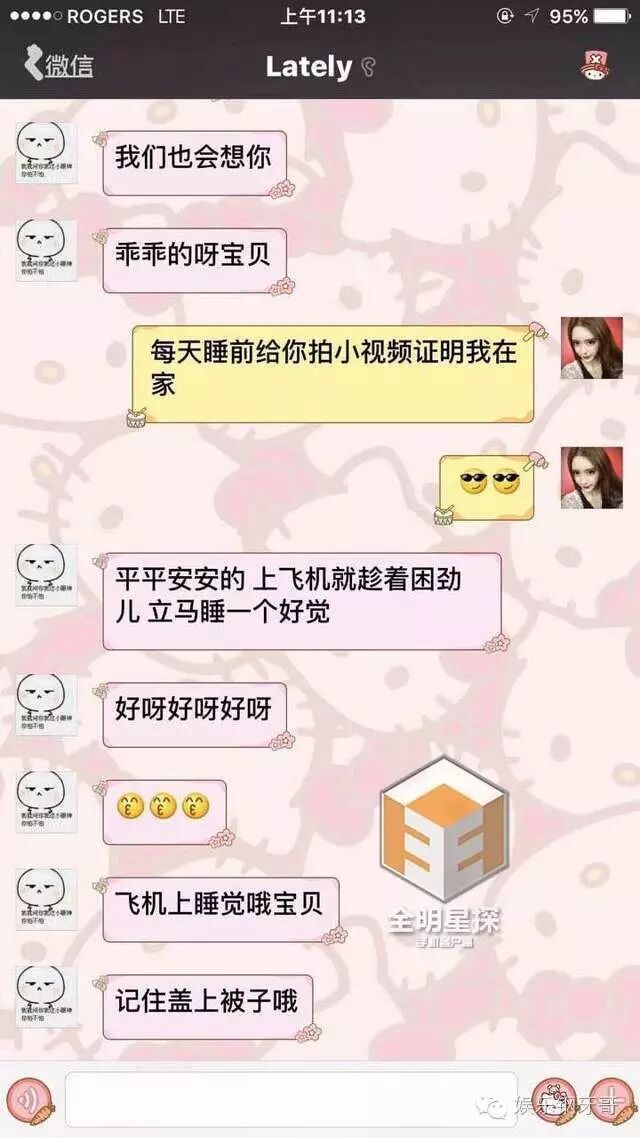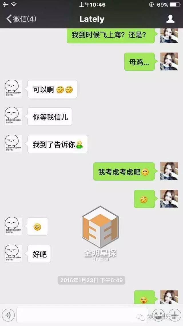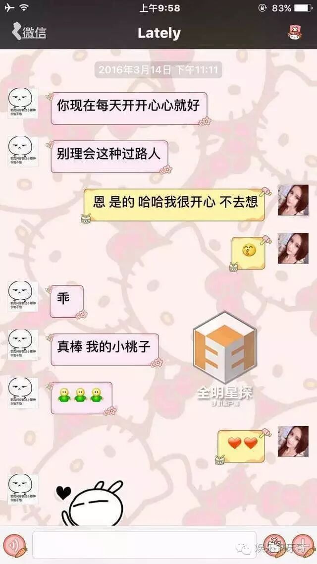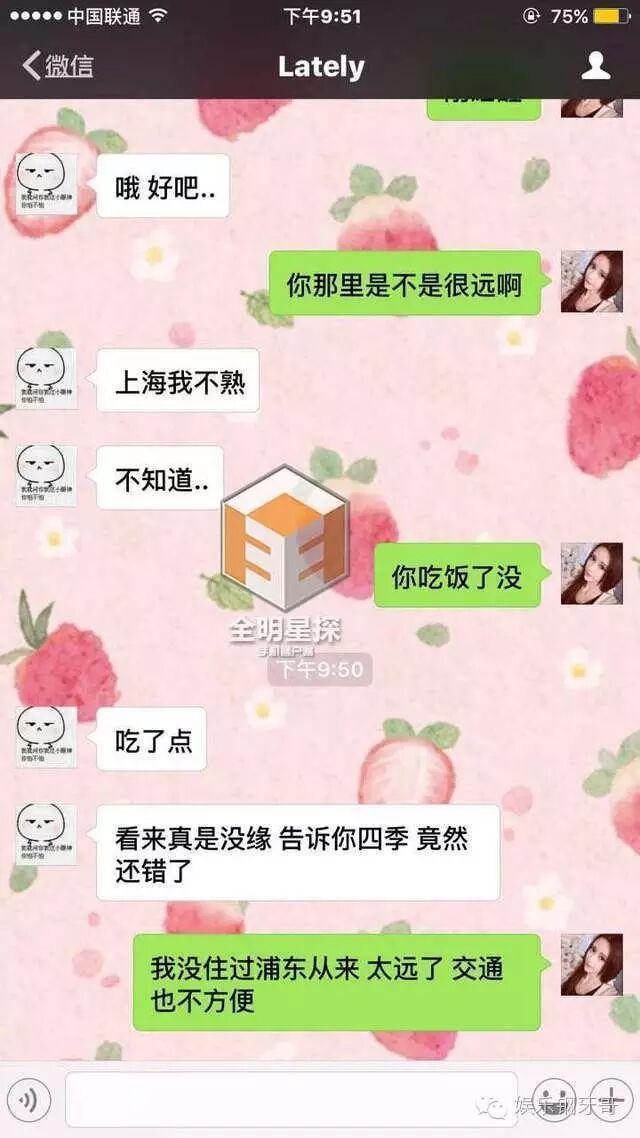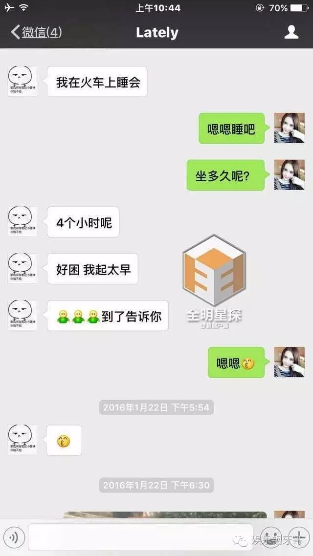 经过短暂的甜蜜后,吴亦凡回到中国工作,从长沙飞到安徽,再从台北飞到上海,一路奔波,而小G娜则一直留在温哥华,但距离阻挡不了两人之间谈情说爱,期间小G娜和吴亦凡一直微信联络。从小G娜提供的她与吴亦凡之间的微信聊天内容可以看出,在1月中下旬期间两人似乎正处在甜蜜期。吴亦凡管小G娜叫“小桃桃”,并称:“我最爱你的素颜,快被你迷死了!”吴亦凡在微信中还曾让小G娜来多伦多陪自己。钢牙哥看到这这聊天记录后,真心觉得甜到齁~原来你是这样的吴亦凡?