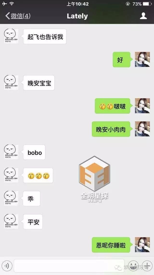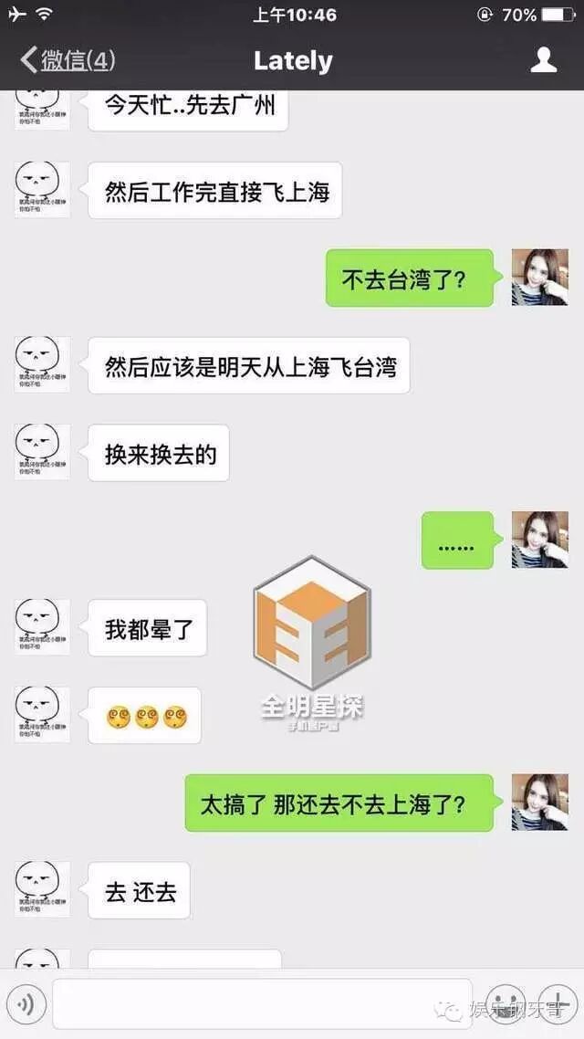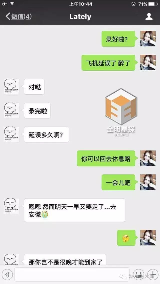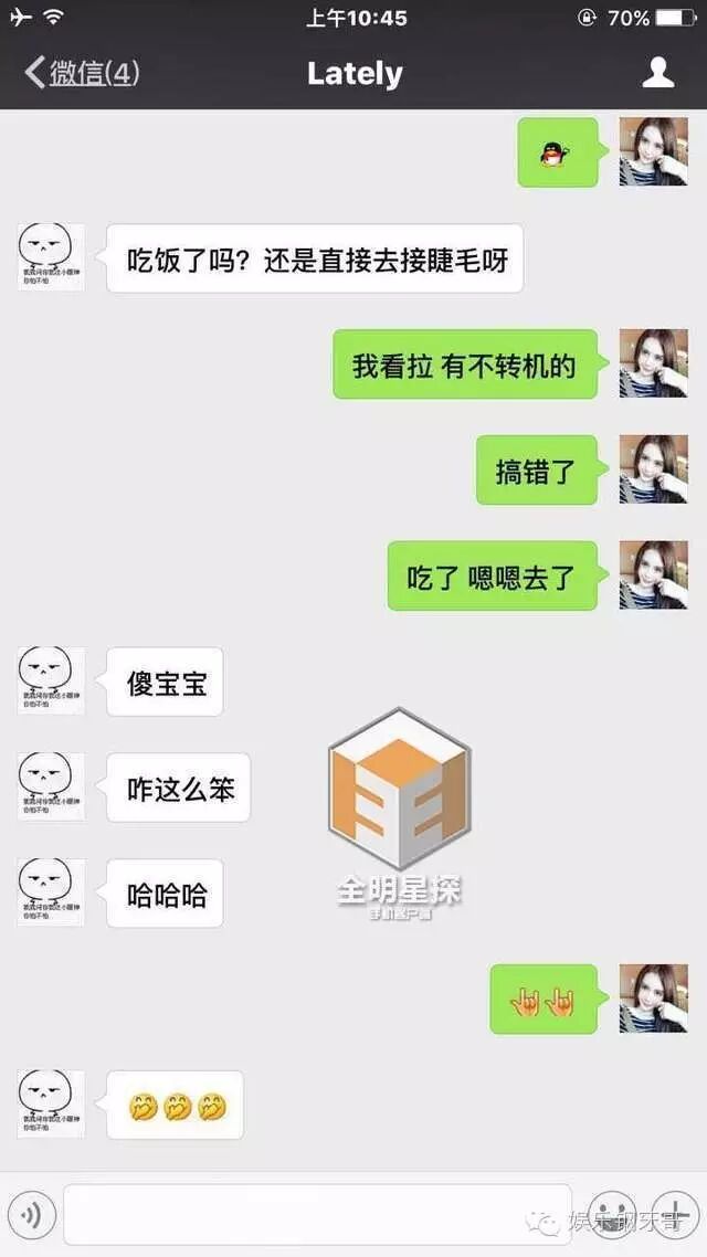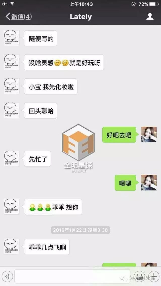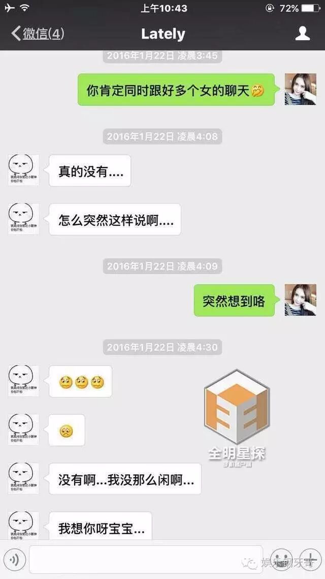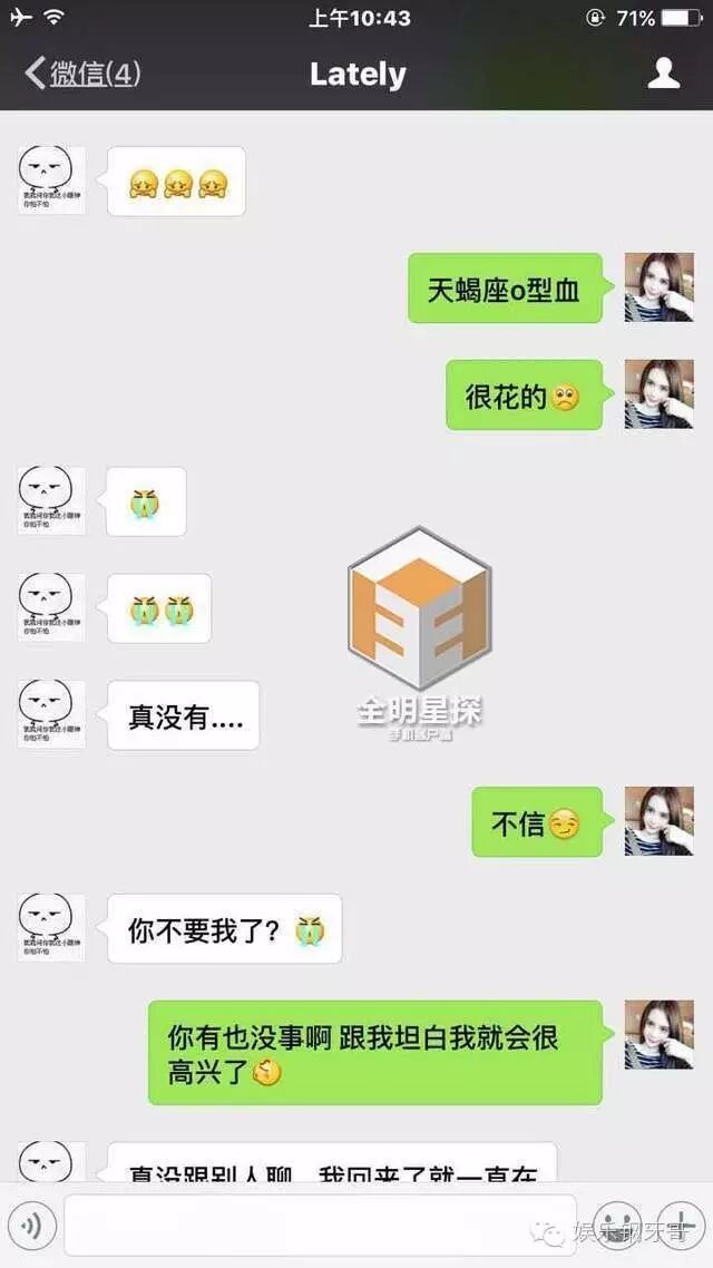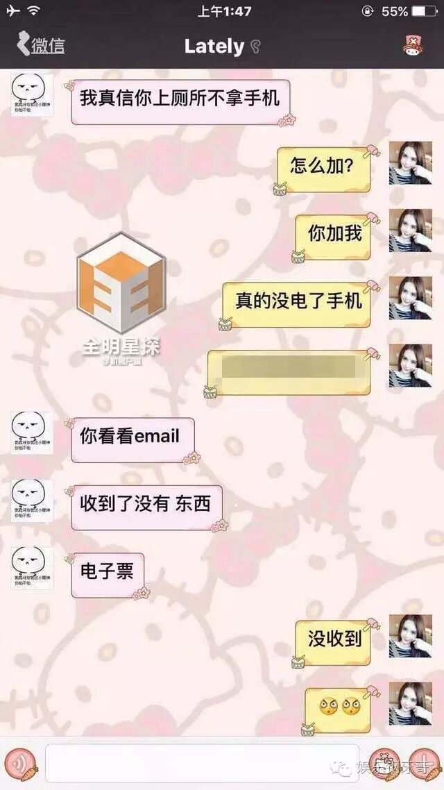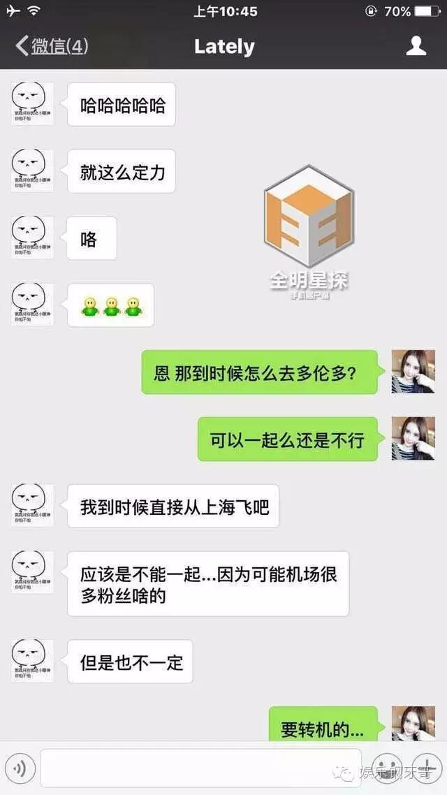 经过短暂的甜蜜后,吴亦凡回到中国工作,从长沙飞到安徽,再从台北飞到上海,一路奔波,而小G娜则一直留在温哥华,但距离阻挡不了两人之间谈情说爱,期间小G娜和吴亦凡一直微信联络。从小G娜提供的她与吴亦凡之间的微信聊天内容可以看出,在1月中下旬期间两人似乎正处在甜蜜期。吴亦凡管小G娜叫“小桃桃”,并称:“我最爱你的素颜,快被你迷死了!”吴亦凡在微信中还曾让小G娜来多伦多陪自己。钢牙哥看到这这聊天记录后,真心觉得甜到齁~原来你是这样的吴亦凡?