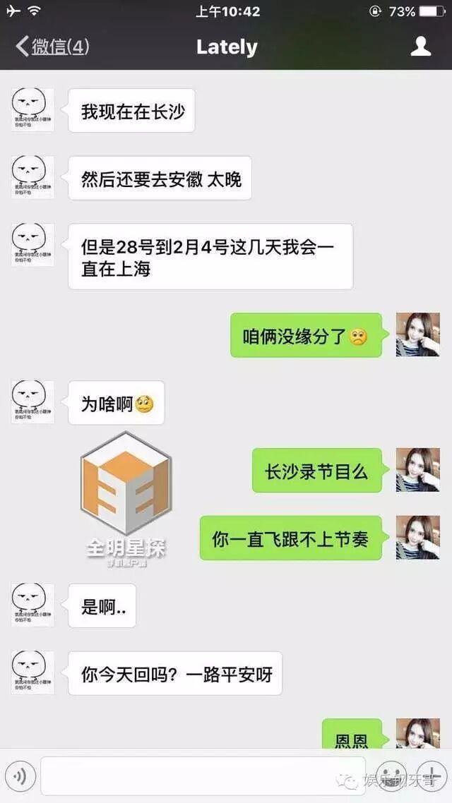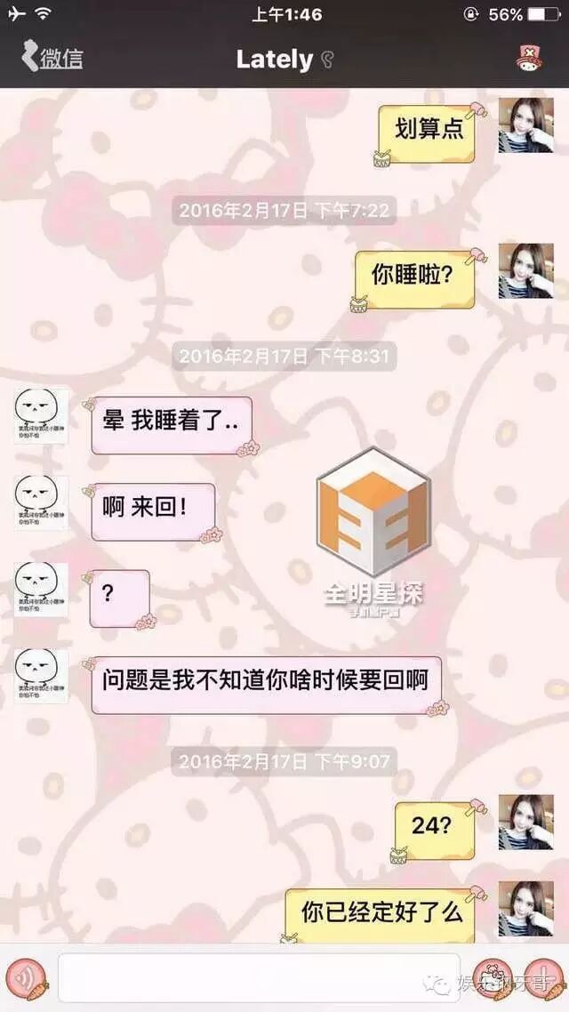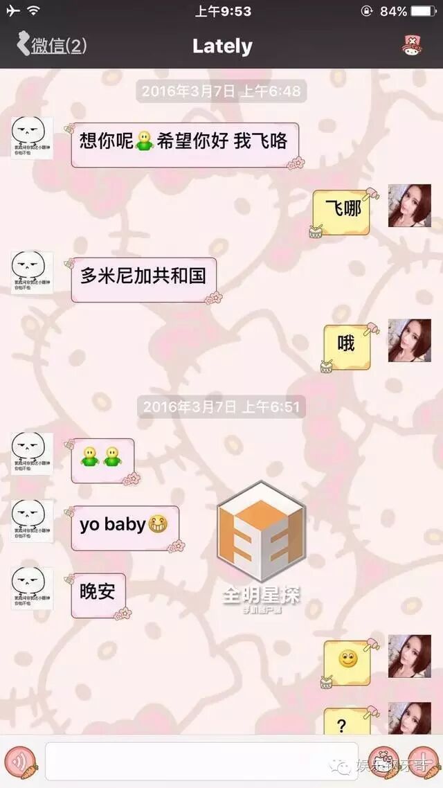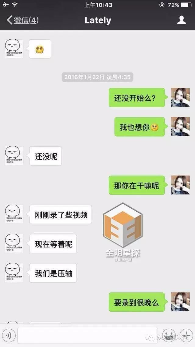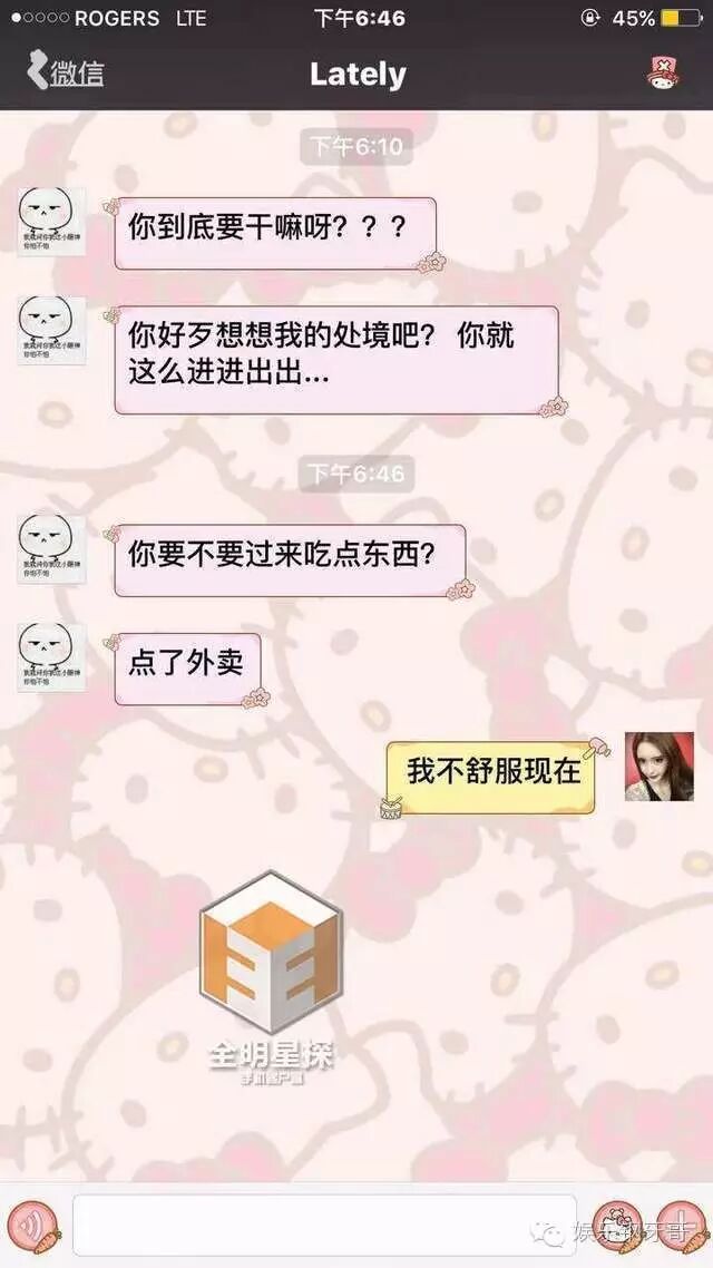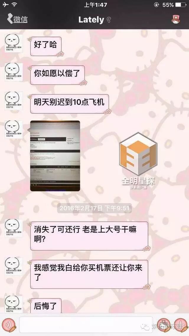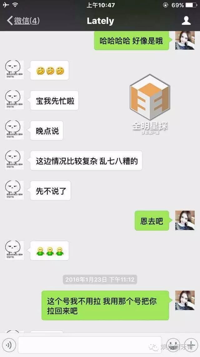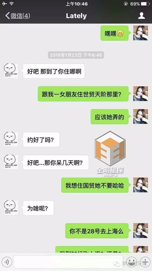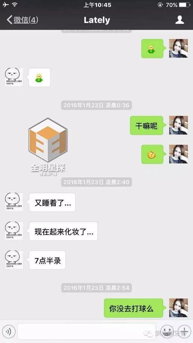 经过短暂的甜蜜后,吴亦凡回到中国工作,从长沙飞到安徽,再从台北飞到上海,一路奔波,而小G娜则一直留在温哥华,但距离阻挡不了两人之间谈情说爱,期间小G娜和吴亦凡一直微信联络。从小G娜提供的她与吴亦凡之间的微信聊天内容可以看出,在1月中下旬期间两人似乎正处在甜蜜期。吴亦凡管小G娜叫“小桃桃”,并称:“我最爱你的素颜,快被你迷死了!”吴亦凡在微信中还曾让小G娜来多伦多陪自己。钢牙哥看到这这聊天记录后,真心觉得甜到齁~原来你是这样的吴亦凡?