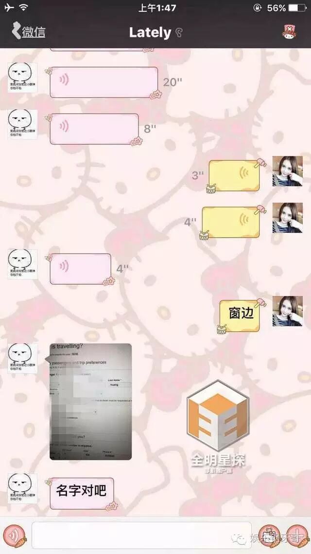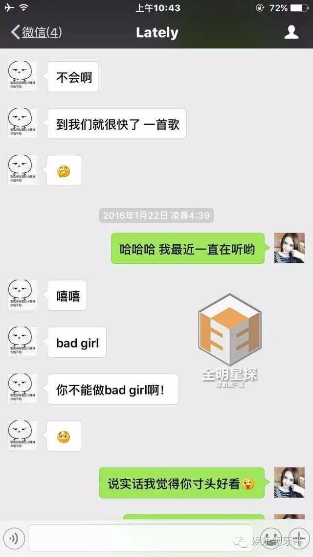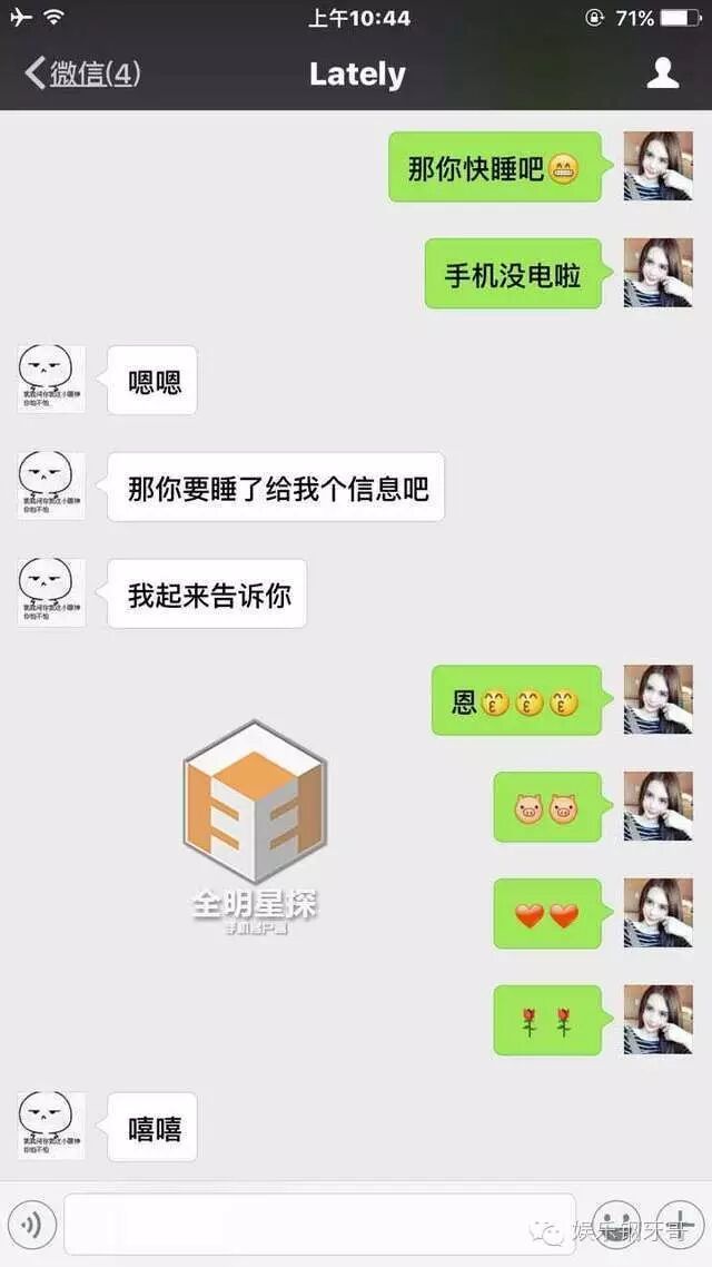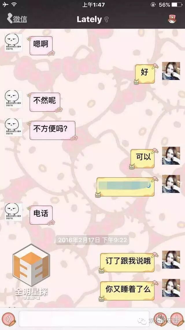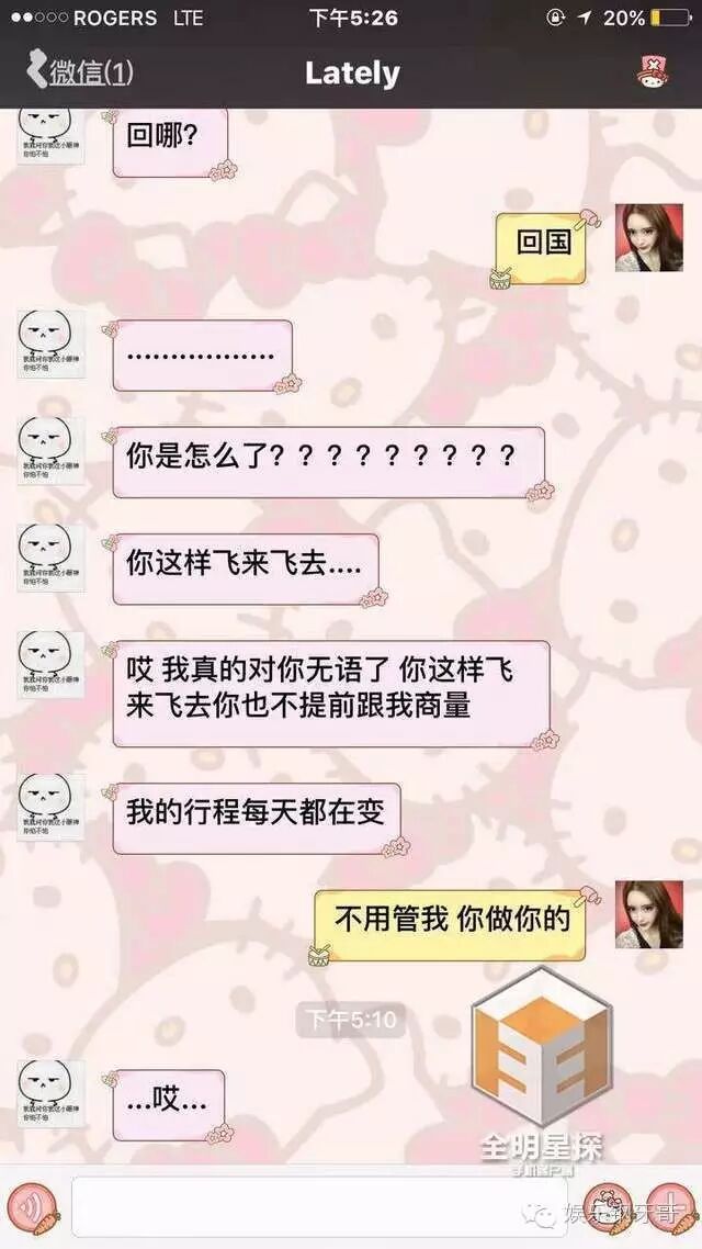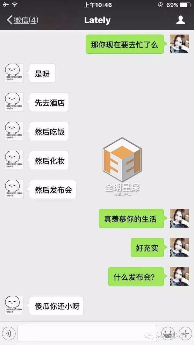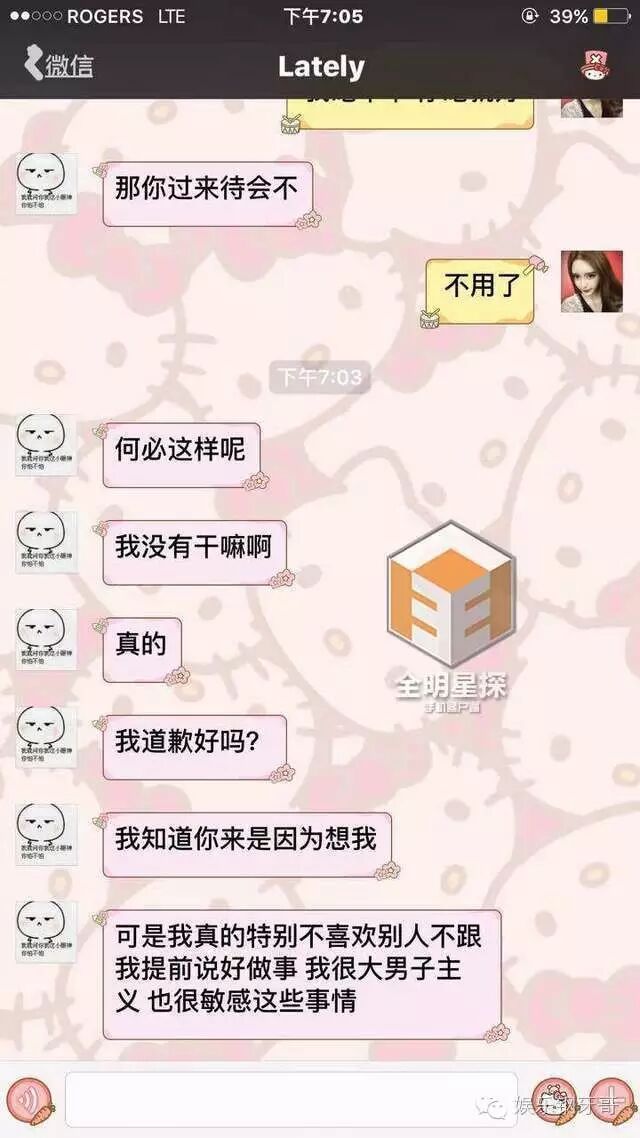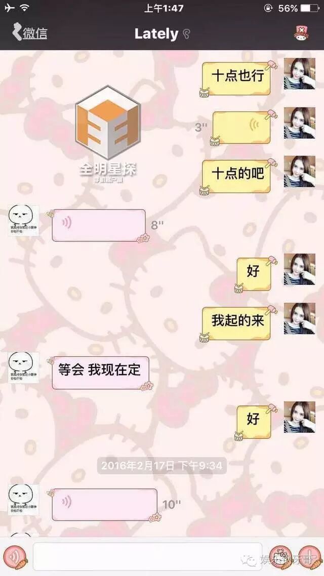 经过短暂的甜蜜后,吴亦凡回到中国工作,从长沙飞到安徽,再从台北飞到上海,一路奔波,而小G娜则一直留在温哥华,但距离阻挡不了两人之间谈情说爱,期间小G娜和吴亦凡一直微信联络。从小G娜提供的她与吴亦凡之间的微信聊天内容可以看出,在1月中下旬期间两人似乎正处在甜蜜期。吴亦凡管小G娜叫“小桃桃”,并称:“我最爱你的素颜,快被你迷死了!”吴亦凡在微信中还曾让小G娜来多伦多陪自己。钢牙哥看到这这聊天记录后,真心觉得甜到齁~原来你是这样的吴亦凡?