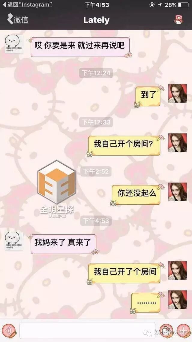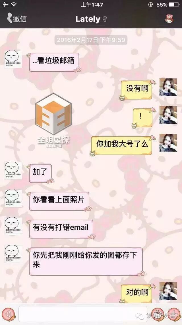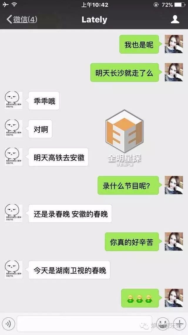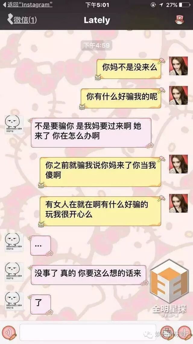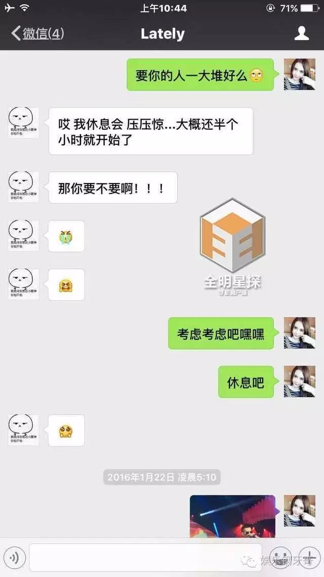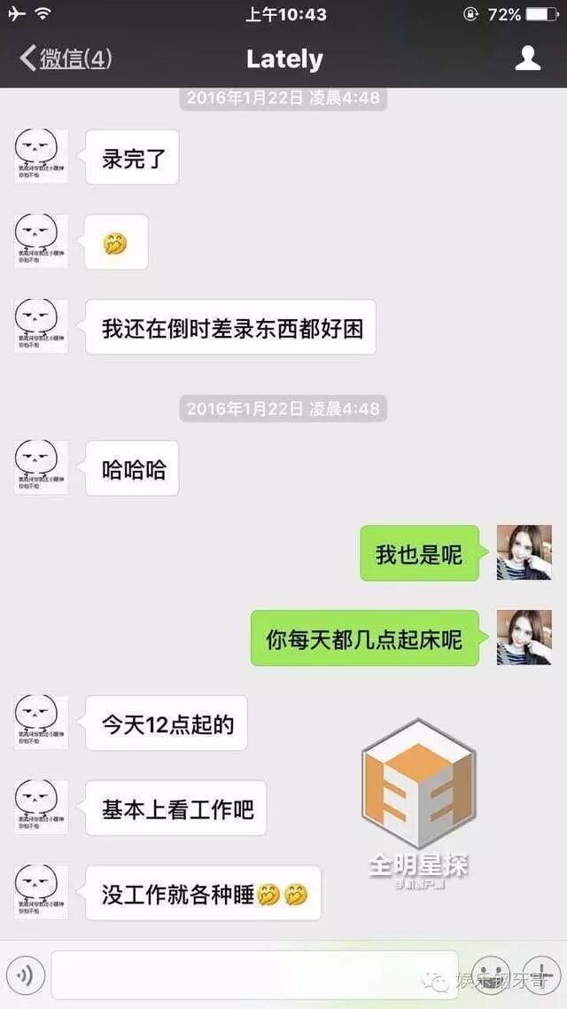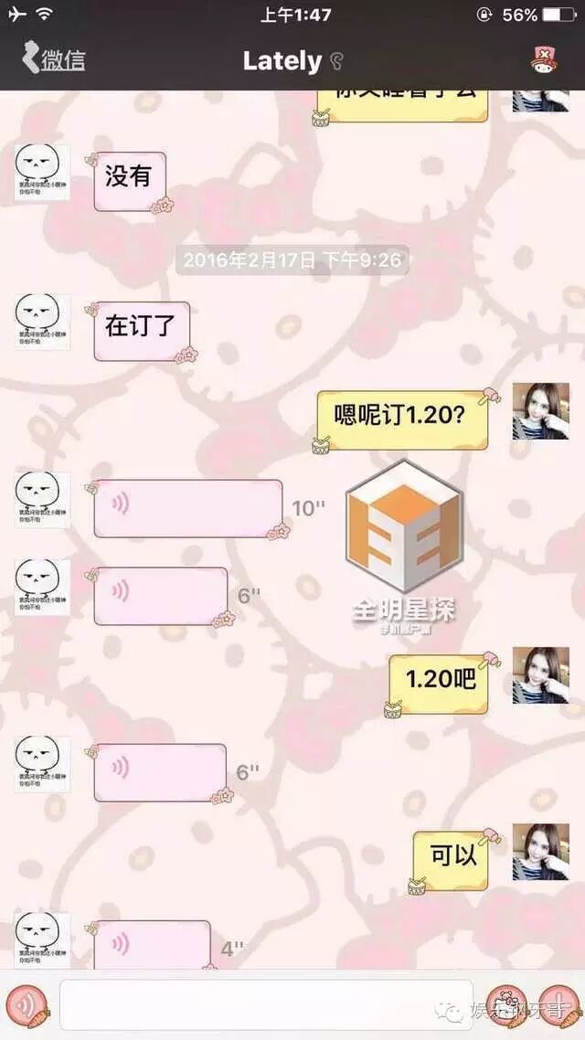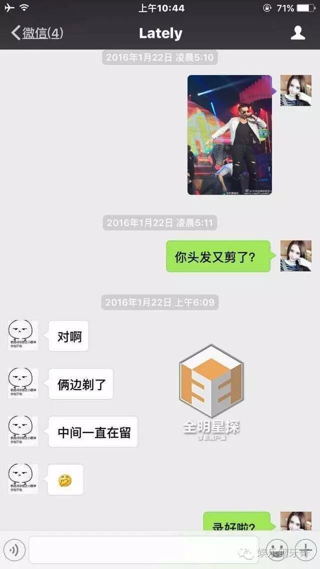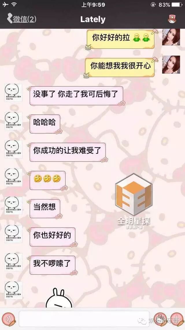 经过短暂的甜蜜后,吴亦凡回到中国工作,从长沙飞到安徽,再从台北飞到上海,一路奔波,而小G娜则一直留在温哥华,但距离阻挡不了两人之间谈情说爱,期间小G娜和吴亦凡一直微信联络。从小G娜提供的她与吴亦凡之间的微信聊天内容可以看出,在1月中下旬期间两人似乎正处在甜蜜期。吴亦凡管小G娜叫“小桃桃”,并称:“我最爱你的素颜,快被你迷死了!”吴亦凡在微信中还曾让小G娜来多伦多陪自己。钢牙哥看到这这聊天记录后,真心觉得甜到齁~原来你是这样的吴亦凡?