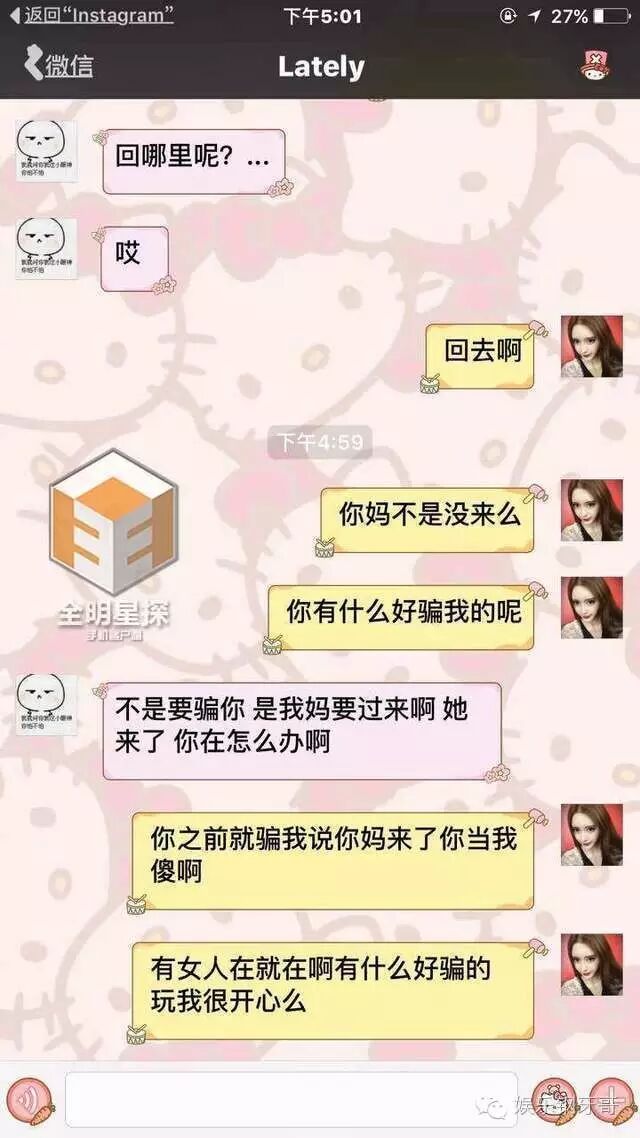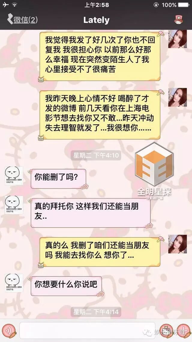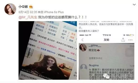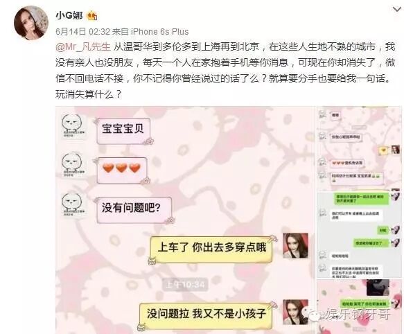 再次回国时还一直和吴亦凡保持维信联系,但从五月中下旬之后吴亦凡仿佛消失了一样,电话不接,微信不回,渐渐明白原因的小G娜非常痛苦,整日以泪洗面,6月14日凌晨在大醉后在微博发出那样的一段文字,排遣苦闷,希望通过网络发声让吴亦凡跟她联系。