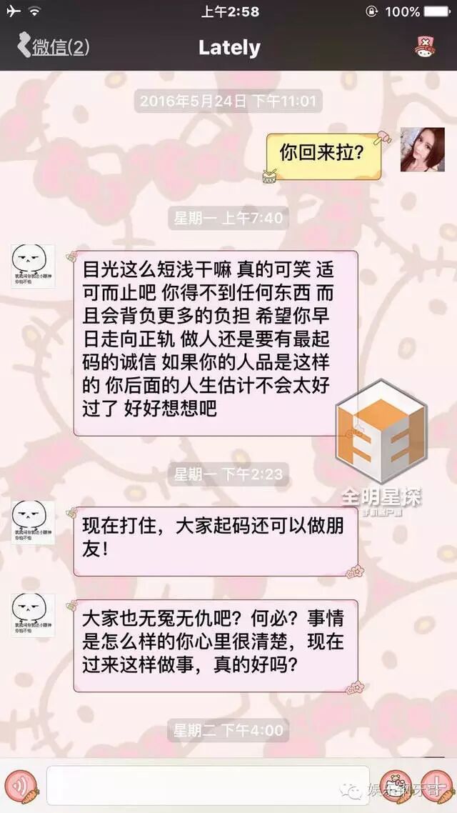 今日小G娜与吴亦凡大量的聊天记录被曝光,其中吴亦凡提到自己录制湖南卫视春晚和安徽卫视的春晚,以及去多伦多参加NBA全明星名人赛,均与现实中吴亦凡参加活动的时间吻合。两人还讨论起他的新发型和歌曲,显得十分真实。聊天记录中最劲爆的内容在于小G娜在网上质疑吴亦凡为何要消失后,吴亦凡发微信对她一顿斥责,并要求她删除微博,还称“希望你早日走上正轨,做人要有起码的诚信,如果你的人品是这样的,你后面的人生估计不会太好过了,好好想想吧。”