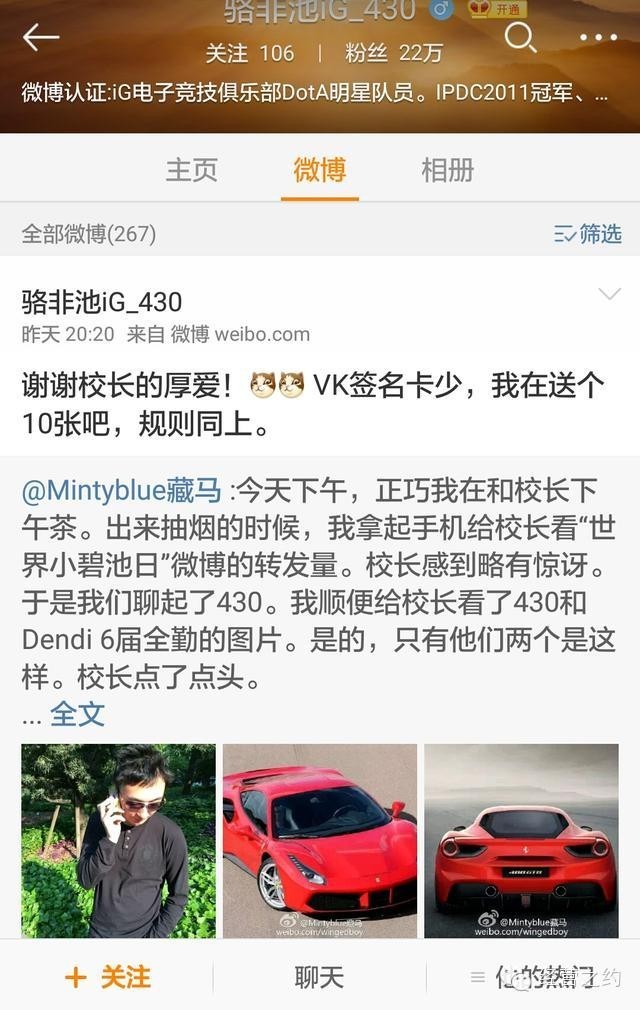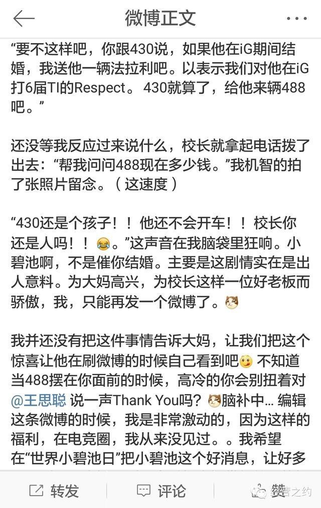 情的起因是这样的。IG电竞俱乐部副总裁藏马和国民老公王思聪一起喝下午茶,期间两人谈到IG俱乐部旗下DOTA2功勋队员430,随后王思聪欲送一辆法拉利488给430,小编上网查了一下,这辆车全套下来将近五百万,惊了呆,不多说上图,看看到底是怎么个情况。
