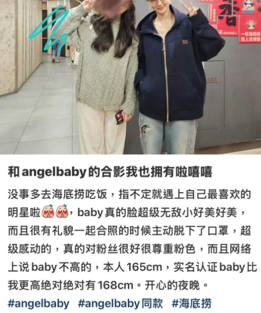 据这位网友的描述,当时她正在海底捞用餐,发现坐在邻桌的一位女生气质出众,容貌小巧精致,定睛一看,竟是Angelababy本人。