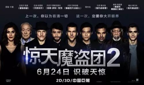 由美籍华裔导演朱浩伟执导,杰西-艾森伯格、伍迪-哈里森、戴夫-弗兰科、丽兹-卡潘、“绿巨人”马克-鲁法洛、迈克尔-凯恩、摩根-弗里曼联合周杰伦、“哈利·波特”丹尼尔-雷德克里夫主演的高智商犯罪魔术动作巨制《惊天魔盗团2》将于6月10日北美上映, 国内定档6月24日。