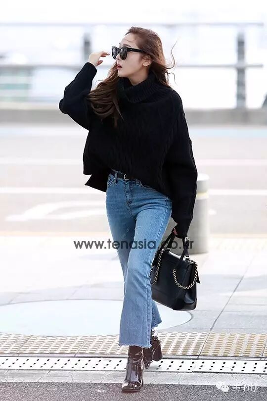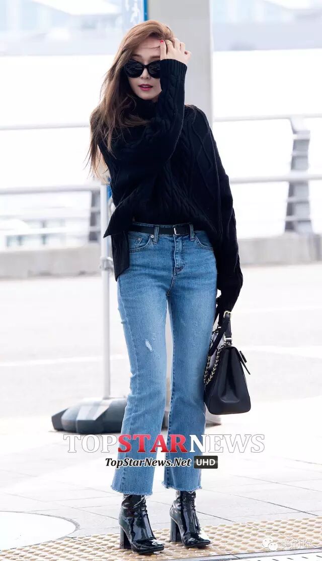 黑色蝙蝠袖毛衣配上牛仔九分喇叭裤,举手投足之间散发出总裁大人的气场,而且显腿长不是一点点啊!
