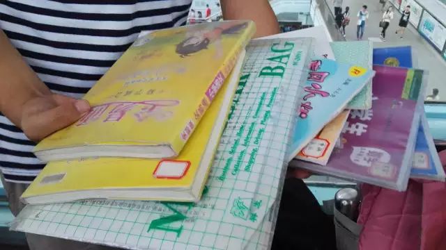 文科目的书,还有3本草稿本,这些重量已经达6.8斤。一些书放不下,她便用手提袋装着。
