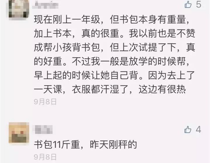 评论中,有不少人认为,看不惯这么宠女儿的,认为帮女儿背书包太娇惯了,这么小年纪就帮忙背书包长大了还得了。