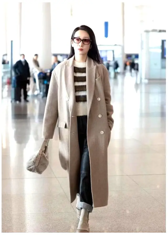 这套机场穿搭就很有代表性。灰米色大衣配条纹针织,下身是卷边牛仔裤和浅色短靴,舒服、轻松,但一点都不随便。尤其是“长外套+九分裤/卷边裤”的组合,特别适合普通人,能把脚踝附近留出一点空间,整个人会显得更轻盈,不会被厚重冬装压住。