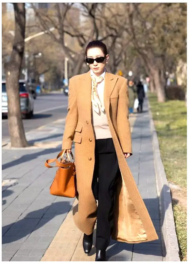 秦海璐这套就很典型:长款驼色大衣,里面叠穿浅色针织和衬衫,再加一条丝巾,立刻就把普通通勤穿搭拉到了另一个层次。这样的搭法特别适合上班族,既有专业感,又不会太板正。