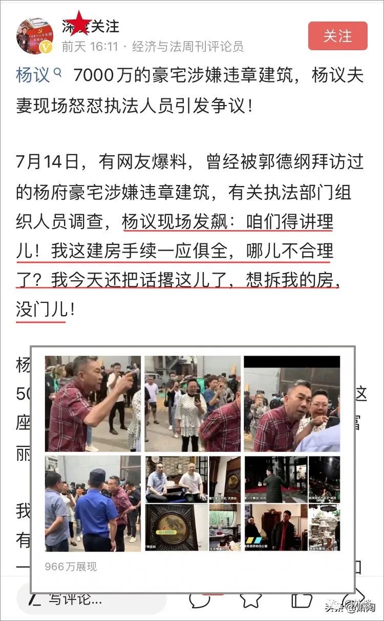有网友在其自媒体上发文称,杨议7000万的豪宅涉嫌违章建筑,杨议夫妇现场怒怼执法人员。该文写道,杨议现场发飙:咱们得讲理儿!我这建房手续一应俱全,哪儿不合理了?我今天还把话撂这儿了,想拆我的房,没门儿!