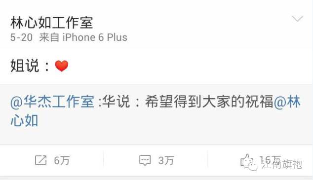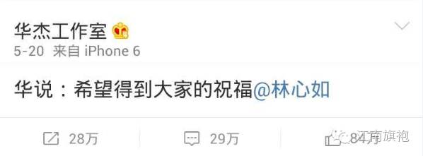 5月20日,霍建华工作室于下午14点左右发布一则“华说,希望得到大家的祝福”的微博,并艾特了林心如,几分钟后,林心如工作室立刻做出回应“姐说,”。这就是在跟广大网友和粉丝们宣布恋爱消息了呀,微博瞬间热闹起来了。