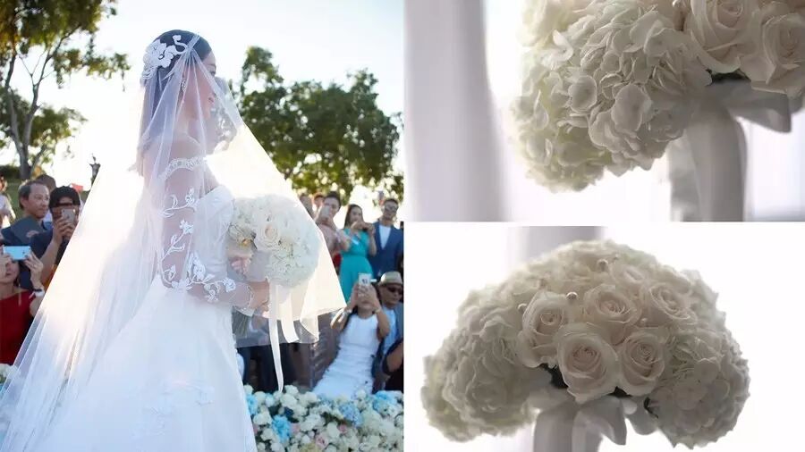 Preston Bailey选用27朵顶级厄瓜多尔粉白玫瑰、9颗珍珠和纯白色的绣球花,制作了一束浪漫柔和的手捧花,以此衬托诗诗恬淡平和的个性。