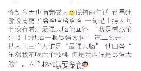 去录制 《最强大脑》,说是顺便看这个节目。六个核桃是冠名商,他说自己不喝,这就尴尬了!
