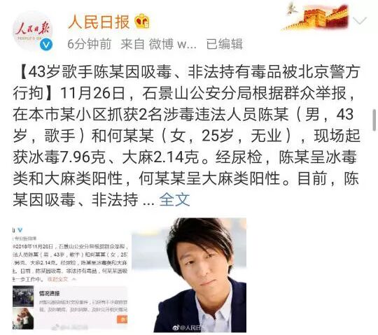 据@平安石景山 ,根据群众举报,在某小区抓获2名涉毒违法人员陈某(男,43岁,歌手)和何某某,经尿检,陈某呈冰毒类和大麻类阳性。目前,陈某因吸毒、非法持有毒品被行政拘留。