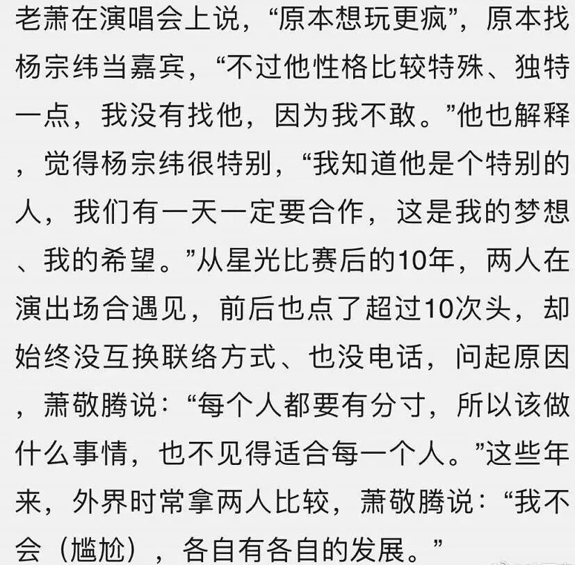 还有时间更早的爆料,杨宗纬被萧敬腾踢馆输不起…萧敬腾在采访中还表示“每个人都要有分寸,所以该做什么事情,也不见得适合每一个人。”