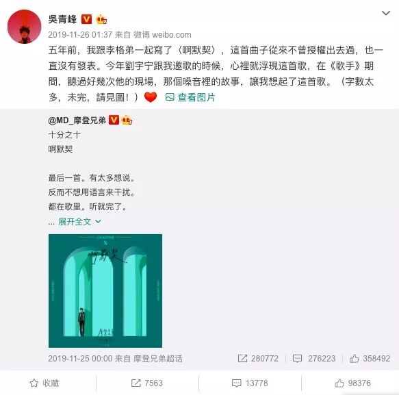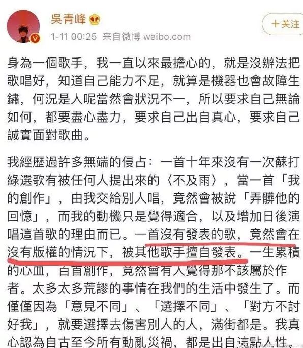 并且吴青峰表示《啊默契》在此前从未授权出去过,自然也就未曾发表过。之后还说了一段很是隐喻的话。