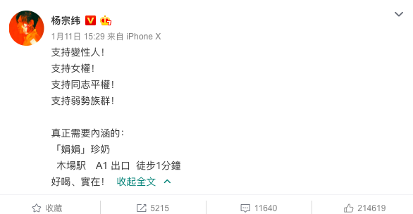 这时候有网友猜测杨宗纬在1月11日发布的那条微博是在暗指吴青峰。