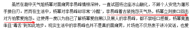 不过令人难以理解还是杨幂这180度大转变的态度吧...在《怦然》时期,接受采访的杨幂谈到和李易峰的关系和之前态度很不一样,说自己和李易峰拍古剑之前就认识很久了。拍完古剑私下仍有联系,而且关系不错。所以这次怦然也是杨幂主动邀请李易峰来演的。