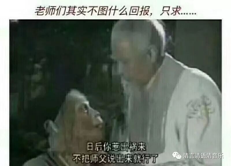 今天教师节,一大早群里啊朋友圈啊各种感恩老师和老师辛苦了,一派不忘师恩没齿难忘的感人迹象;画风是中午开始变的,我寻思可能是老师们上午上完课开始刷朋友圈了,于是老师们纷纷表达不求回报,只求“日后你惹出祸来,不把师父说出来就行。”