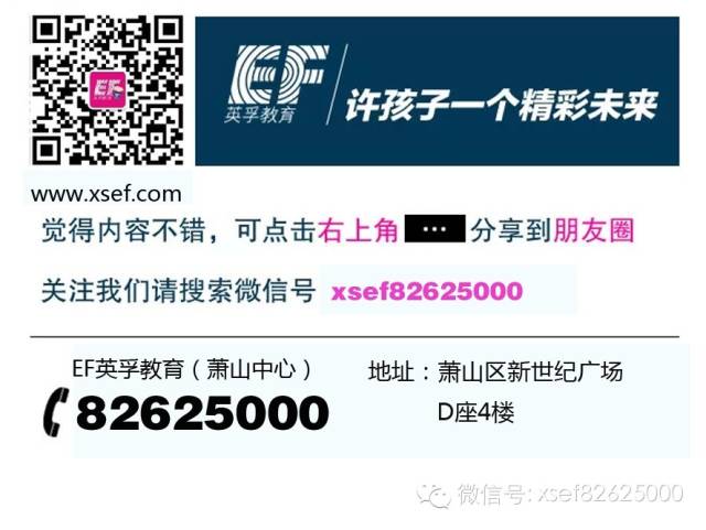分享图文并截图至英孚教育萧山微信公众账号即可免费获得价值500元课程体验一次,可享3-18周岁单人次免费外教试听课一节或外教一对一口语测试+量身定制英语学习计划。(仅限校外学员参加)--------------------------------------------------